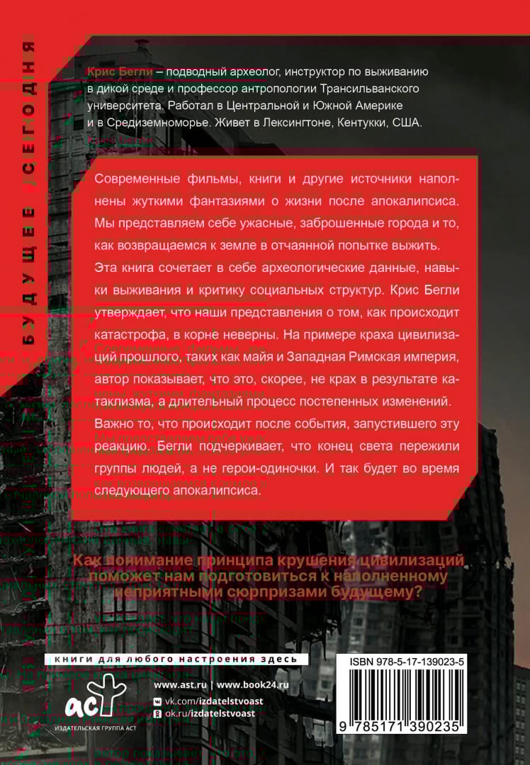 In his book, Chris Begley argues that our ideas about how disaster happens are fundamentally wrong. Using the collapse of past civilizations such as the Mayans and the Western Roman Empire, the author shows that it is not a cataclysmic collapse, but a long process of gradual change. Some people abandon their homes and neighbors. Others band together to start anew. What matters most is what happens after the event that triggers this reaction. Begley emphasizes that it was communities, groups of people, who survived the end of the world, not lone heroes. And so it will be in the next apocalypse.