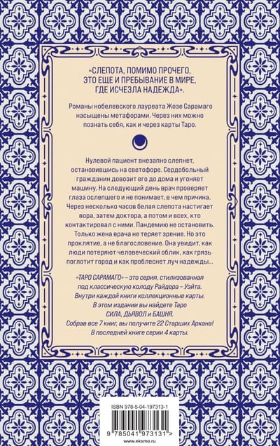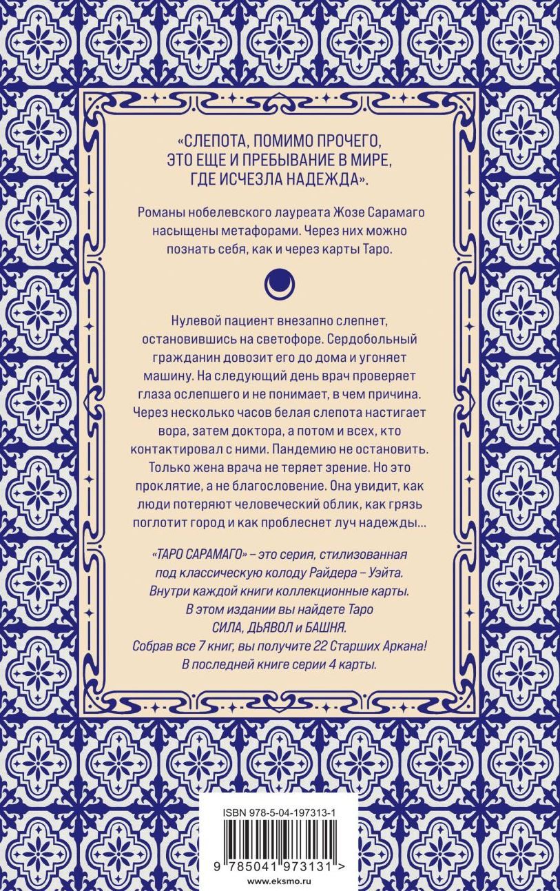 This is a disaster novel. A metaphorical novel. Moral blindness becomes physical blindness. The author's style of the writer - the absence of direct speech, exclamation marks and question marks - makes the reader lose their usual landmarks and, in an allegorical sense, plunge into blindness.