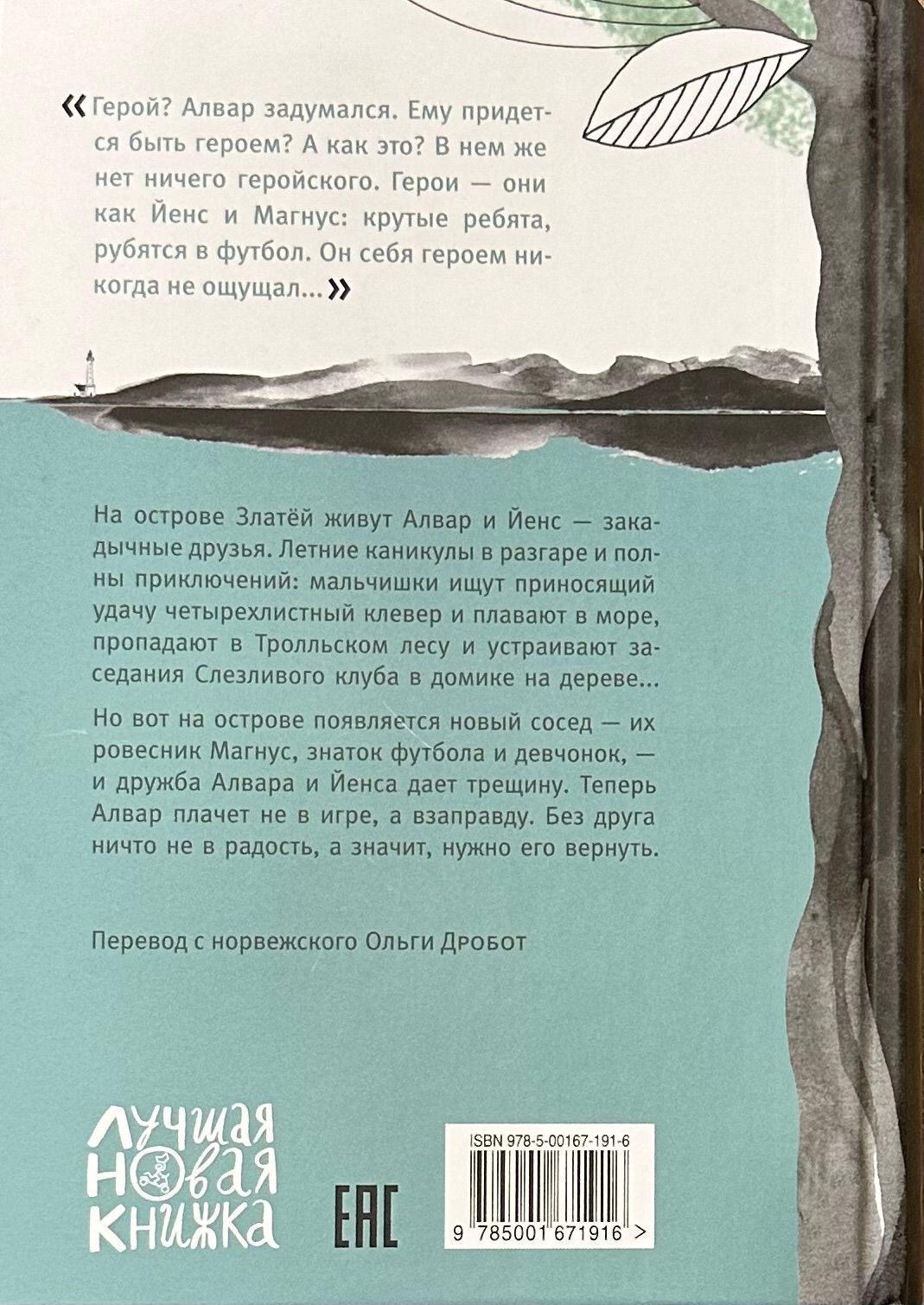Christian Wiik Jærde's book tells a story that takes place in the middle of summer vacation on the island of Zlatøy with two cronies Alvar and Jens. Carefree days go by, and the boys don't have a minute of free time: they have to look for a lucky four-petaled clover, swim in the sea and hold meetings of the Tearful Club in the tree house. But the strong friendship between Alvar and Jens cracks when they have a new neighbor - their age Magnus, a lover of soccer and girls. Alvar, who thought his friendship with Jens was unbreakable and unbreakable, turns out to be a third party and a traitor. However, Alvar does not believe that the friendship is ruined forever, and is determined to get his best friend back.