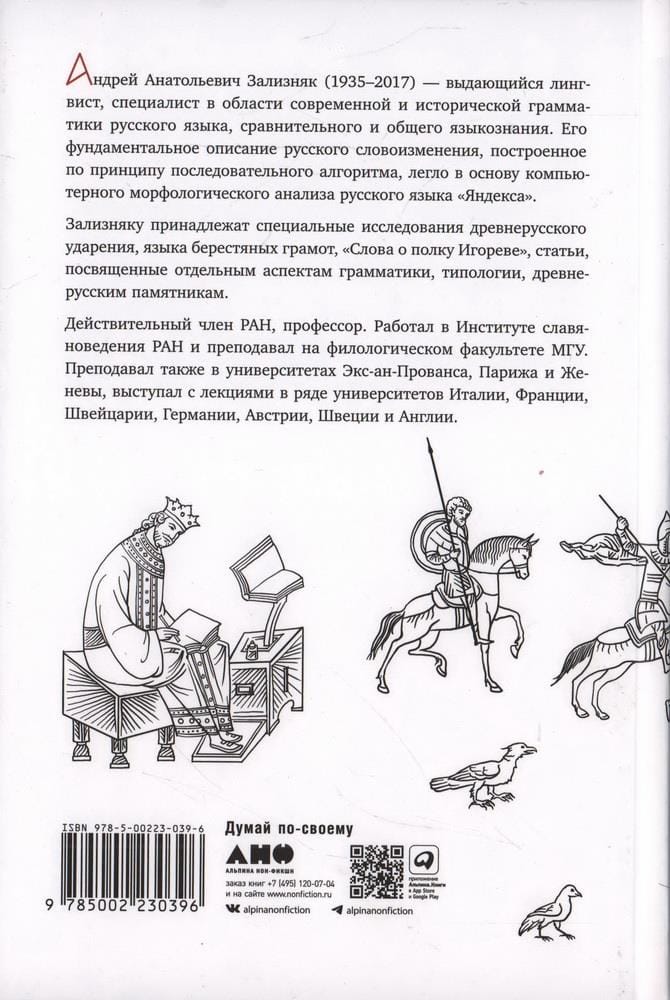 The destruction of the only copy of this work deprives researchers of the opportunity to analyze the handwriting, paper, ink and other material characteristics of the original source. In such circumstances, the most solid basis for resolving the problem of the authenticity or forgery of The Tale of Igor's Campaign turns out to be the language of this monument. This book by the outstanding linguist Andrei Anatolyevich Zaliznyak (1935–2017) is devoted to the study of the linguistic side of this problem.