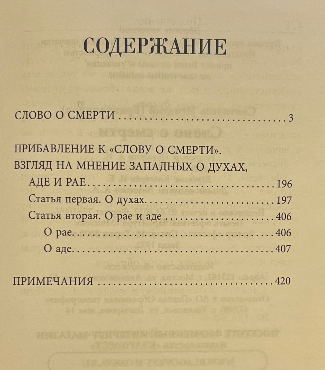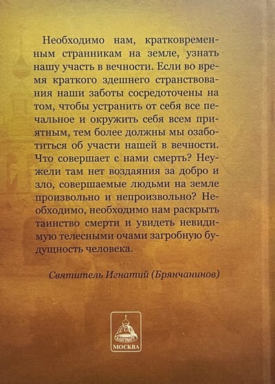 In the work of St. Ignatius (Bryanchaninov) "Word on Death" it is said about the afterlife of the soul after the bodily death of man and about the correct construction of spiritual life for the salvation of his soul with the citation of many illustrative examples from the holy theological experience and the lives of the saints.