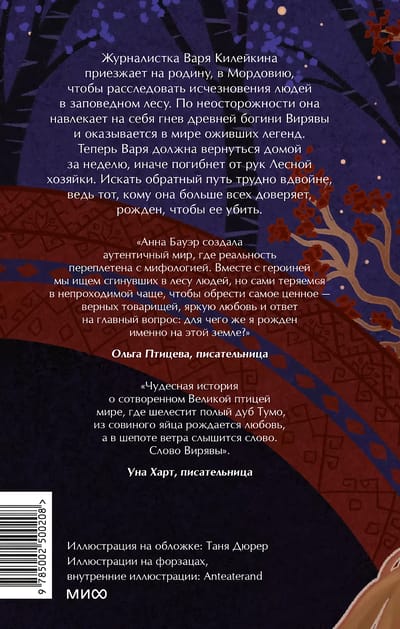 Journalist Varya Kileikina comes to her homeland, Mordovia, to investigate the disappearances of people in a protected forest. Through carelessness, she incurs the wrath of the ancient goddess Viryava and finds herself in a world of living legends. Now Varya must return home in a week, otherwise she will die at the hands of the Forest Mistress. Finding a way back is doubly difficult, because the one she trusts most of all was born to kill her.