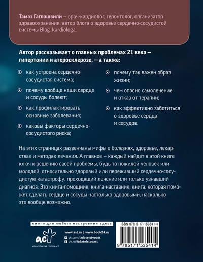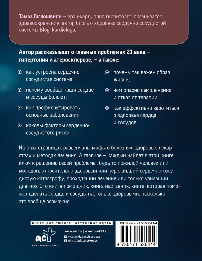 Tamaz Gagloshvili is a cardiologist, gerontologist, health care organizer, and author of Blog_kardiologa, a blog about cardiovascular health. In the book, the author talks about the main problems of the 21st century - hypertension and atherosclerosis - as well as: