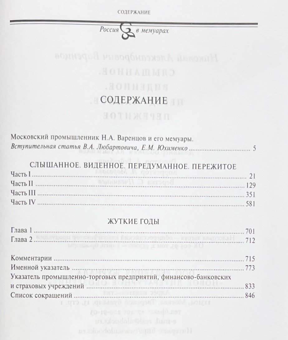 Memoirs of Nikolai Aleksandrovich Varentsov (1862-1947), a prominent Moscow businessman and public figure, cover the period from the middle of the 19th century to 1905. They describe the history of the formation and development of the largest Moscow firms, banks, trading houses, give vivid characteristics of their owners; the book contains everyday sketches of merchant life in Moscow, as well as a statement of dramatic and anecdotal events in the lives of famous Moscow businessmen (Alekseevs, Bakhrushins, Konovalovs, Morozovs, Ryabushinskys, Khludovs, etc.).
