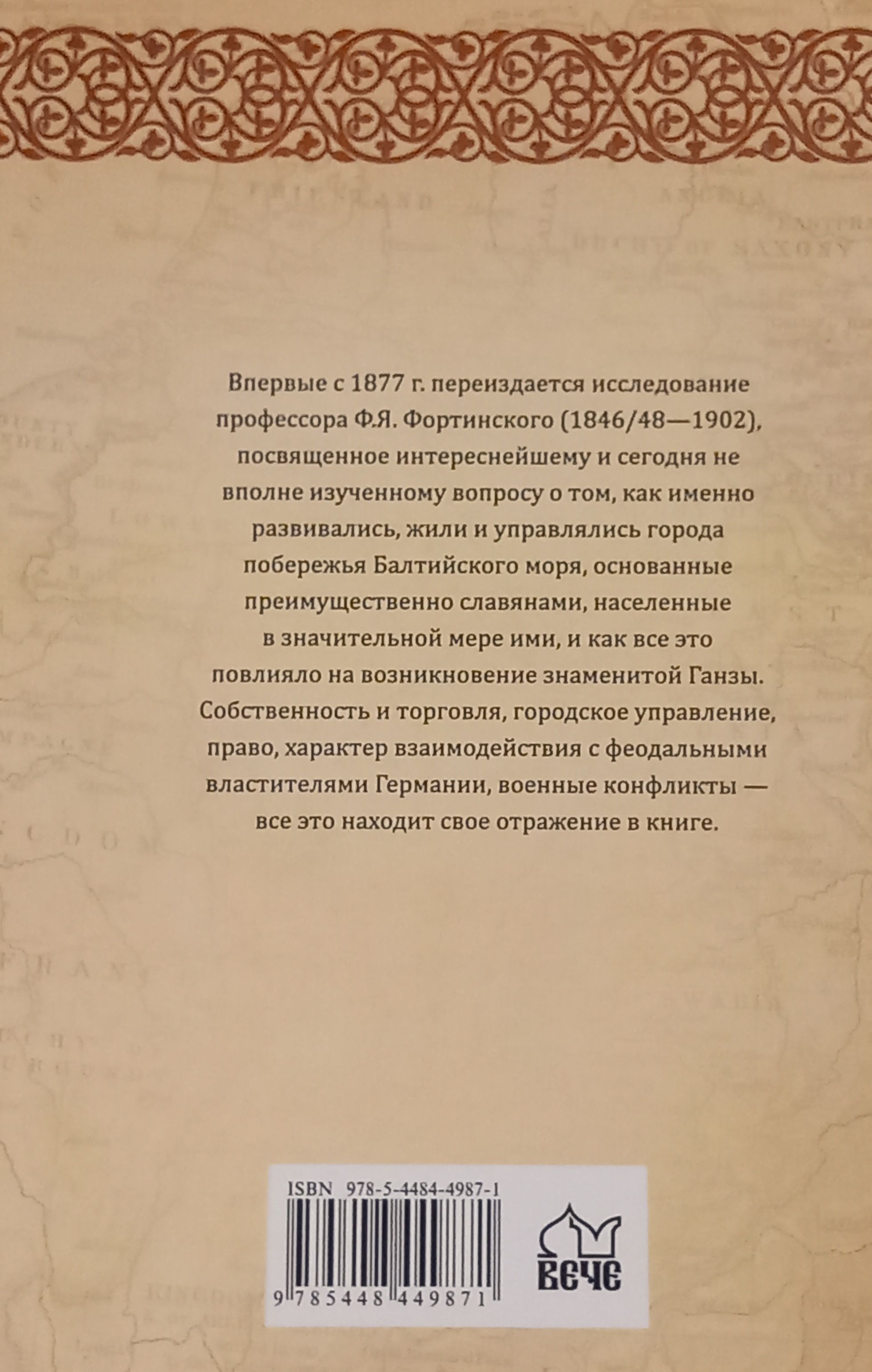 For the first time since 1877, the research of Professor F. Ya. Fortinsky (1846/48-1902) is republished. It is devoted to the most interesting and today not fully studied question of how exactly the cities of the Baltic Sea coast, founded mainly by Slavs, inhabited to a large extent by them, developed, lived and were governed, and how all this influenced the emergence of the famous Hansa. Property and trade, city government, law, the nature of interaction with the feudal rulers of Germany, military conflicts. All this is reflected in the book.