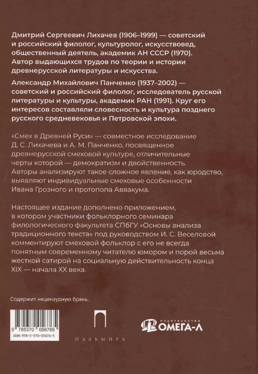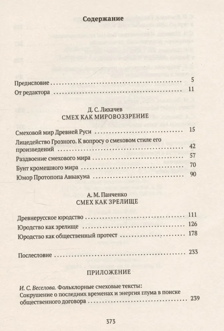 Laughter simultaneously contains both destructive and creative principles. On the one hand, it returns the world to its original chaos, destroying the symbolic system of culture; on the other, it creates a world opposite to the culture being ridiculed—a world free from conventions and social norms. In their outstanding work, "Laughter in Ancient Rus'," D.S. Likhachev and A.M. Panchenko explore the specifics of ancient Russian humorous culture: they examine the democratic nature of laughter, analyze the complex phenomenon of foolishness for Christ's sake, and identify the individual humorous characteristics of Ivan the Terrible and Archpriest Avvakum.