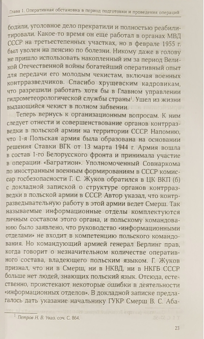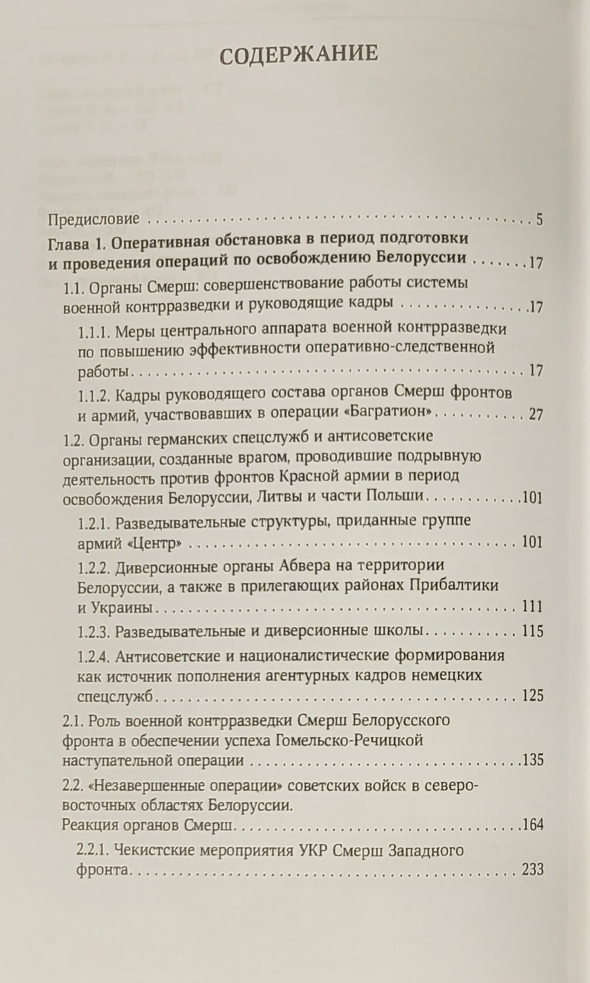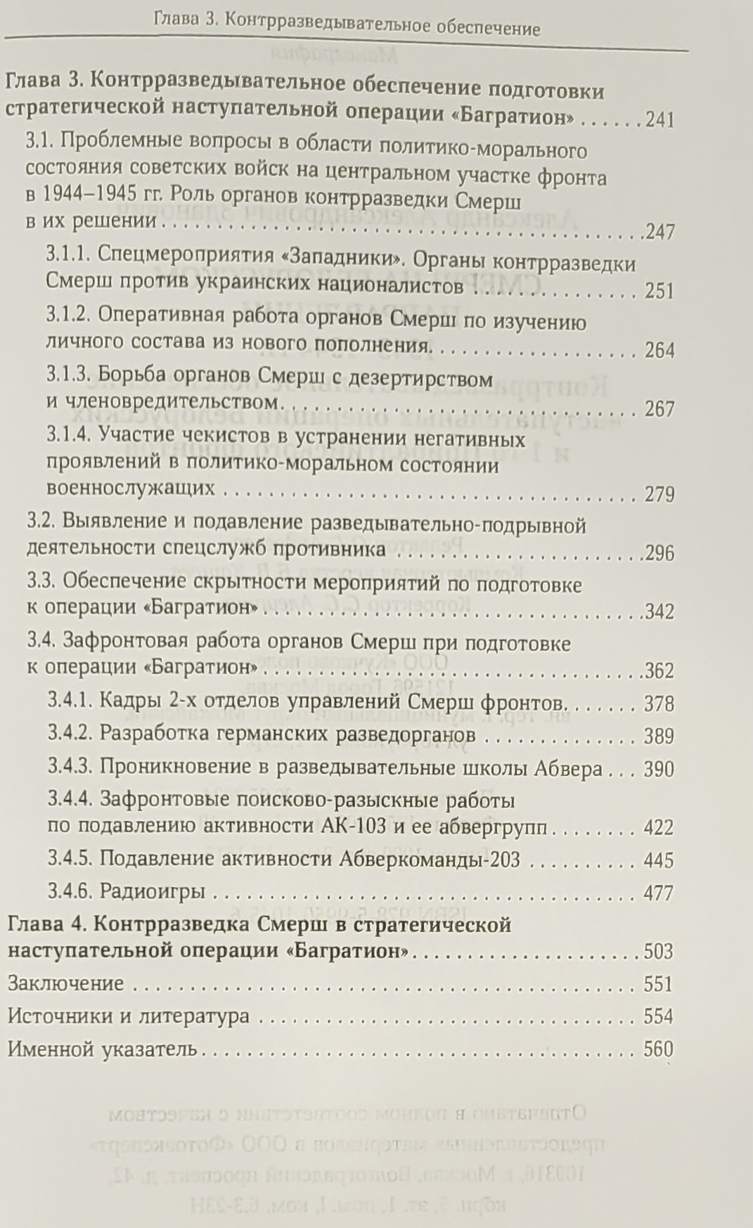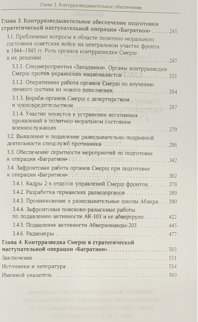 At the same time, the author does not avoid considering the difficulties that arose in the covert confrontation with the enemy. Much attention in the monograph is paid to active behind-the-front activities of Smersh apparatuses to penetrate into the intelligence and sabotage schools of the Abwehr and its field organs attached to Army Group "Center". Due attention is paid to radio games as one of the most sophisticated but effective methods of reducing the enemy's intelligence activity to obtain the information he needed and to disinform him about the plans of the VGK Stavka and the front command.