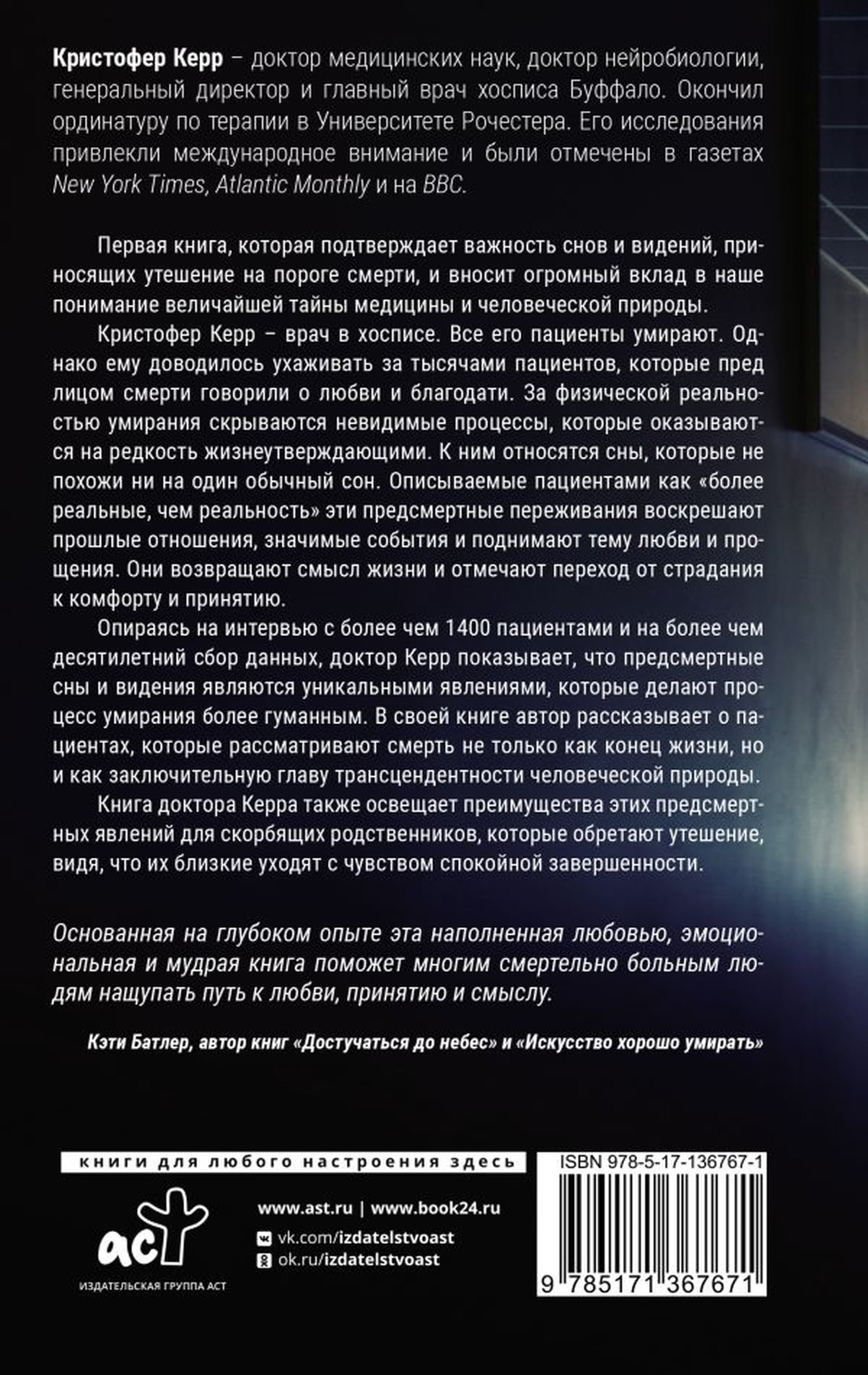 Christopher Kerr is a hospice physician. All his patients die. However, he has cared for thousands of patients who, in the face of death, spoke of love and grace. Behind the physical reality of dying lie invisible processes that prove remarkably life-affirming. These include dreams that are unlike any ordinary dream. Described by patients as "more real than reality," these near-death experiences evoke past relationships and significant events and raise themes of love and forgiveness. They restore meaning to life and mark the transition from suffering to comfort and acceptance.