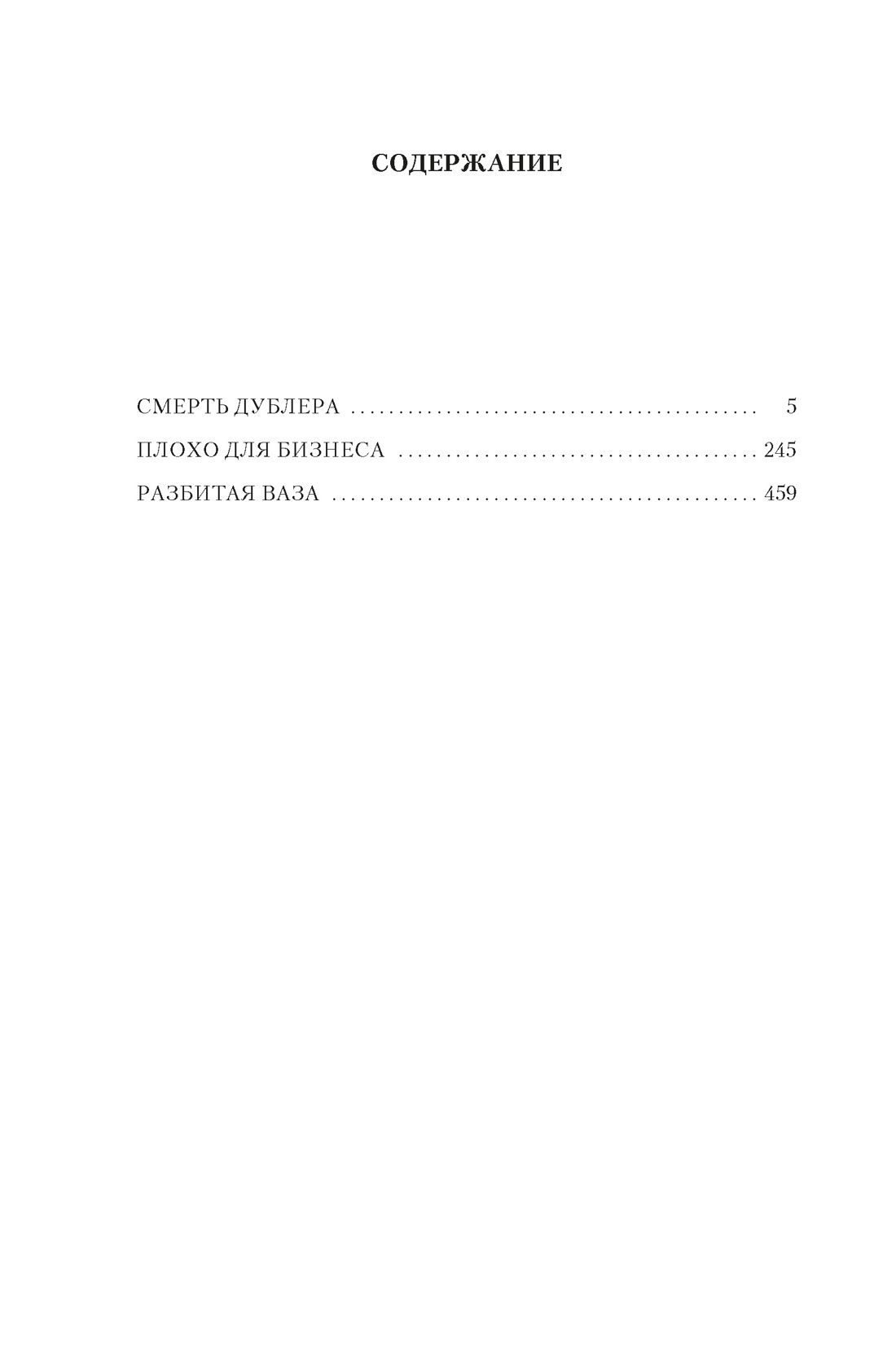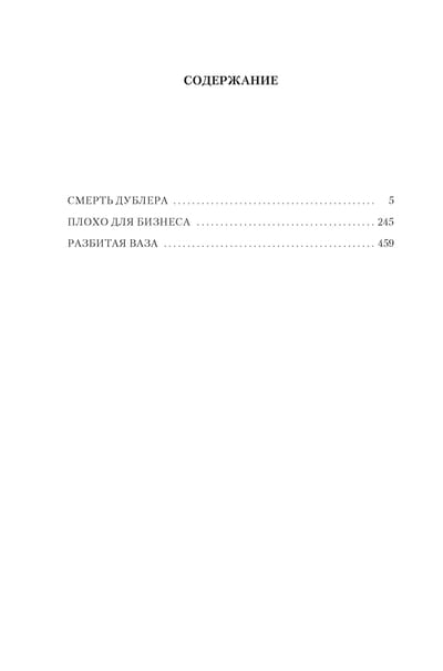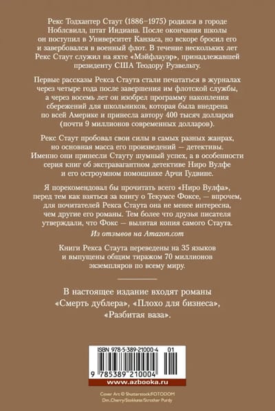 Rex Stout, creator of the famous detective series about Niro Wolfe, a great gourmet, passionate lover of orchids and one of the greatest detectives ever described in literature, this time entrusts the investigation of intricate crimes to private detective Tecumseh Fox, Westchester County, New York. The body of Ridley Thorpe, a financier with an untarnished reputation, is found in a secluded woodland cottage. Andy Grant, who visited Thorpe's estate the night before the murder and was the first to discover the corpse, is charged with the crime. Nancy Grant, Andy's sister, turns to Tecumseh Fox to clear her brother of the charge of culpable homicide. Fox takes on the investigation ("Death of a Doublet"). It's very bad for business when someone unknown adds quinine to cans of quality product. Private investigator Amy Duncan takes the case, but she is soon pulled off the investigation. Before that, Amy's car accidentally collides with Fox's car - fortunately, without serious consequences - and the girl shares with the detective her suspicions about who is to blame for the spoilage of products. The culprit Amy considers the owners of the firm that competes with the company of her uncle, Arthur Tingley. The girl goes to visit her uncle and finds him dead in his own office ... ("Bad for Business") It all started with a violin. Tecumseh Fox's friend, a former violinist, persuades the private investigator to participate in a charity event to buy a valuable instrument for a young virtuoso violinist, Jan Tusar. Fox is not a fan of music, but together with a friend he comes to Carnegie Hall to hear Jan perform. The concert goes badly, and it seems that the violin is to blame. When after the concert Fox and his friend rush backstage to comfort Jan, they find the violinist dead - he shot himself in front of witnesses, and the violin was lost in the turmoil ("The Broken Vase").