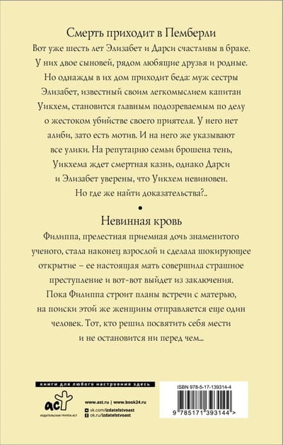 Elizabeth and Darcy have been happily married for six years. They have two sons and loving friends and family. But one day trouble comes to their home: Elizabeth's sister's husband, Captain Wickham, known for his frivolity, becomes the prime suspect in the brutal murder of his friend. He has no alibi, but he has a motive. And all the evidence points to him. The family's reputation is tarnished, Wickham faces the death penalty, but Darcy and Elizabeth are convinced that Wickham is innocent. But where will they find the proof? Philippa, the adorable adopted daughter of a famous scientist, has finally become an adult and made a shocking discovery - her real mother has committed a terrible crime and is about to be released from prison. While Philippa is making plans to meet her mother, another person goes in search of the same woman. Someone who has decided to devote himself to revenge and will stop at nothing ...