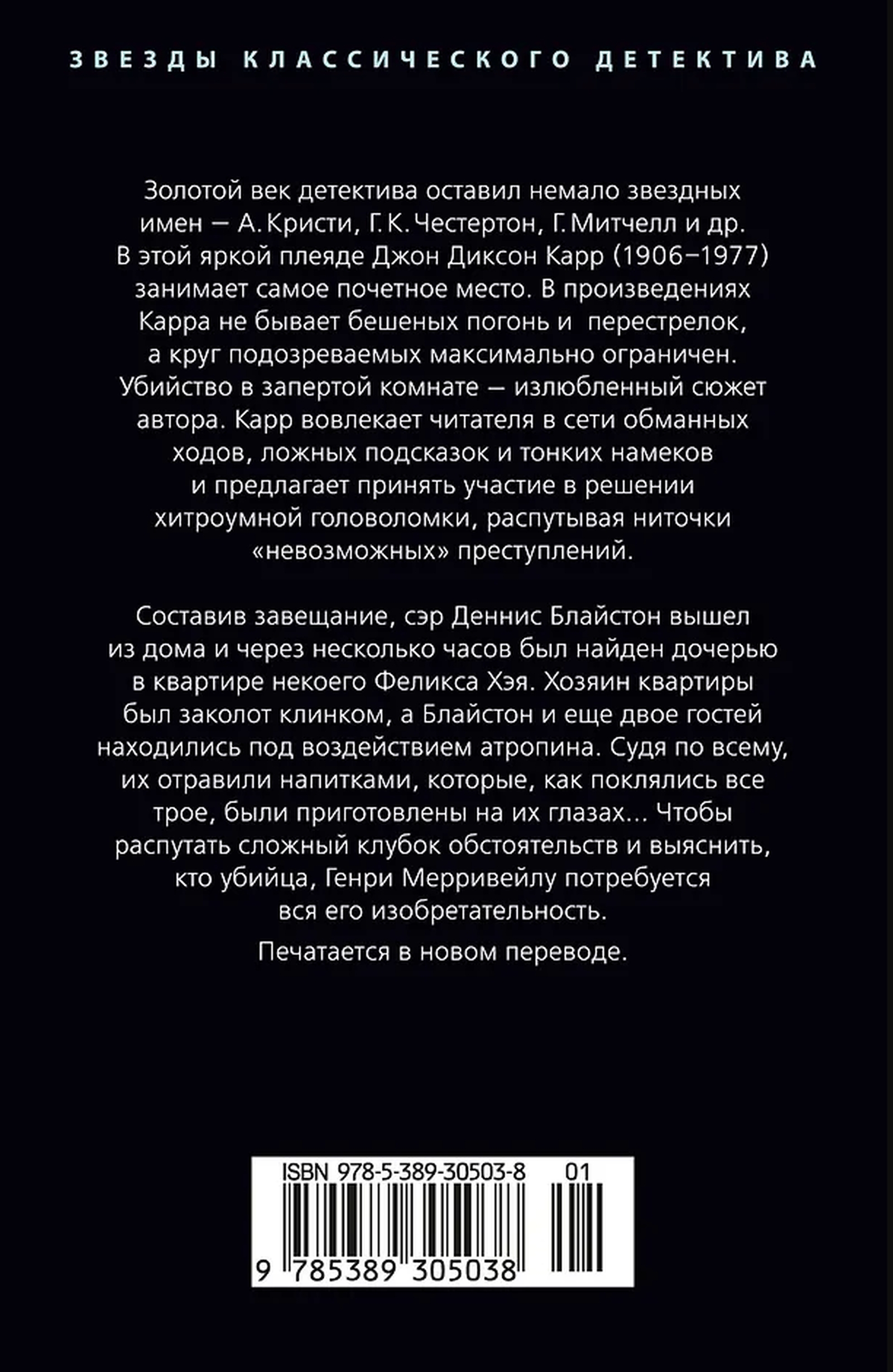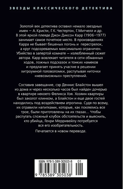 The golden age of detective fiction produced many stellar names—A. Christie, G.K. Chesterton, H.R. Mitchell, and others. Among this illustrious group, John Dickson Carr (1906–1977) occupies a prominent place. Carr's works avoid frantic chases and shootouts, and the pool of suspects is kept as narrow as possible. The locked-room murder is the author's favorite plot device. Carr draws the reader into a web of deception, false clues, and subtle hints, inviting them to participate in solving a cunning puzzle, unraveling the threads of "impossible" crimes.