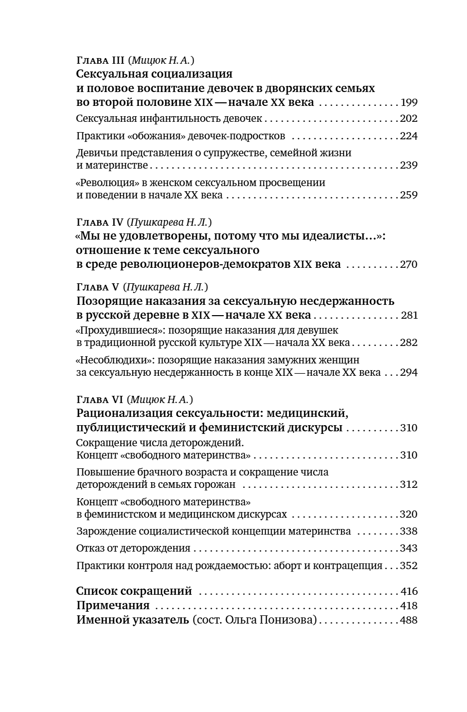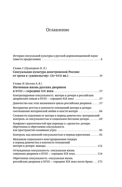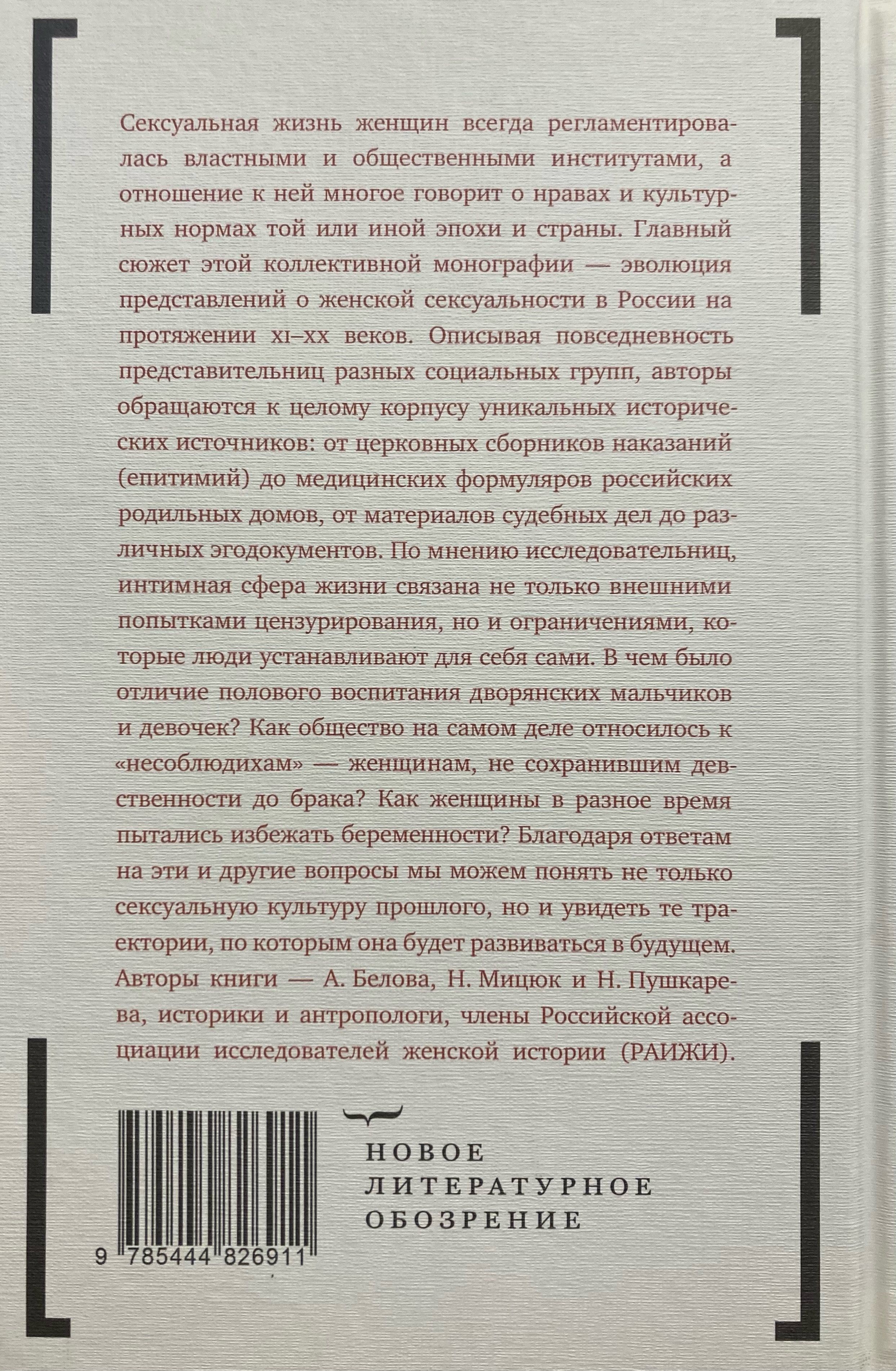 Women's sexual life has always been regulated by government and public institutions, and attitudes toward it say a lot about the morals and cultural norms of a particular era and country. The main subject of this collective monograph is the evolution of ideas about female sexuality in Russia during the 11th–20th centuries. Describing the everyday life of representatives of different social groups, the authors turn to a whole corpus of unique historical sources: from church collections of punishments (penances) to medical forms of Russian maternity hospitals, from court case materials to various ego-documents. According to the researchers, the intimate sphere of life is connected not only with external attempts at censorship, but also with restrictions that people set for themselves. What was the difference between the sex education of noble boys and girls? How did society actually treat "non-observant women" — women who did not preserve their virginity before marriage? How did women at different times try to avoid pregnancy? Thanks to the answers to these and other questions, we can not only understand the sexual culture of the past, but also see the trajectories along which it will develop in the future. The authors of the book are A. Belova, N. Mitsyuk and N. Pushkareva, historians and anthropologists, members of the Russian Association of Women's History Researchers (RAWHRR).
