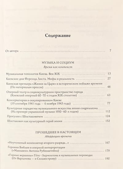 This book by a well-known musicologist from Kiev includes articles and essays from different years. The research covers Russian music of the 19th century, music of the Soviet era, the avant-garde, and postmodernism. These phenomena are presented both in panoramic coverage and through the analysis of specific musical works. The first section focuses on the life of music in interaction with the social demands of the time. The second section is devoted to the corrective function of time: a number of examples show how musical or literary texts appear in a different light in each epoch. The third section examines events and characters significant for Ukrainian culture.