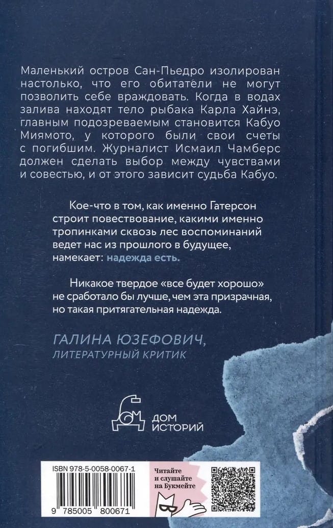 In 1954, tragedy strikes - the body of local fisherman Carl Heine is found in the waters of Puget Sound. Kabuo Miyamoto, an American of Japanese descent, is accused of murder. The trial is watched by all the islanders, and the case is covered by Ismail Chambers, editor of the local newspaper and a war veteran. Years ago Ismail had an affair with a Japanese girl, Hatsue, who grew up and married Kabuo. In his search for justice, the journalist begins his own investigation and has to make a difficult choice between his feelings and his conscience.