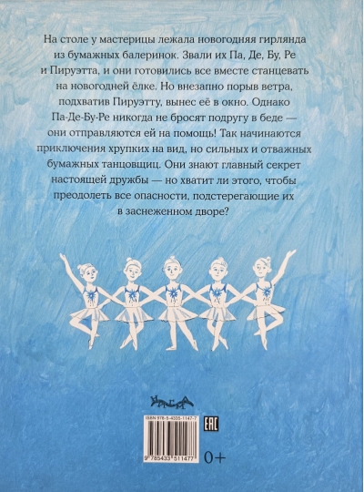 On the craftswoman's table lay a New Year's garland of paper ballerinas. Their names were Pa, De, Bu, Re and Pirouette, and they were getting ready to dance together on the New Year's tree. But suddenly a gust of wind picked up Pirouette and carried her out the window. However, Pa-De-Bu-Re would never abandon a friend in trouble - they went to help her! This is how the adventures of the fragile-looking, but strong and courageous paper dancers began. They know the main secret of true friendship - but will this be enough to overcome all the dangers that await them in the snowy yard?