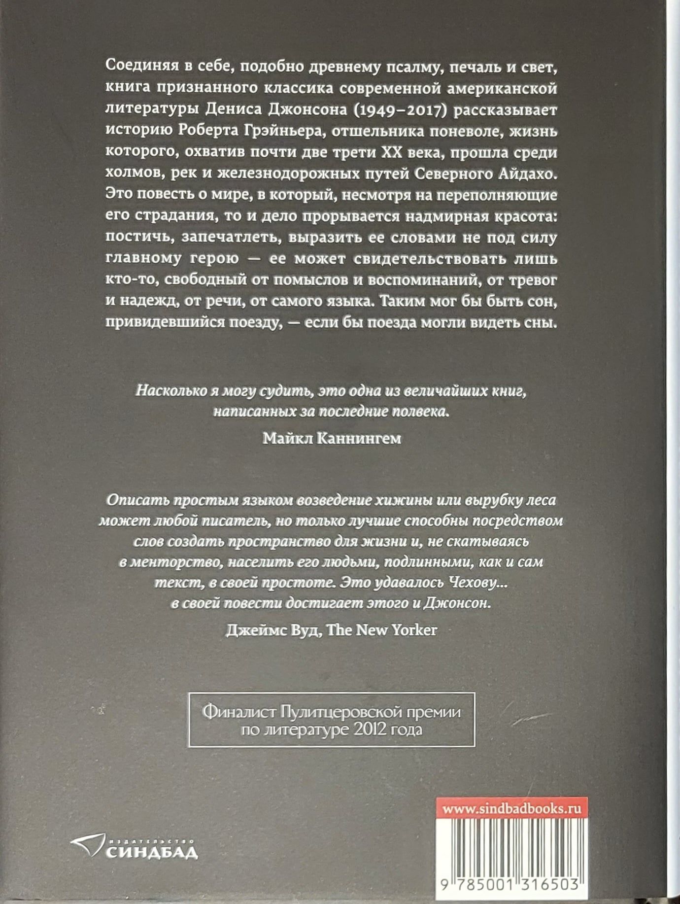 Combining, like an ancient psalm, sorrow and light, this book by Denis Johnson (1949-2017), a recognized classic of modern American literature, tells the story of Robert Granier, a recluse whose life, spanning nearly two-thirds of the twentieth century, took place among the hills, rivers, and railroad tracks of Northern Idaho. This is a tale of a world into which, despite the suffering that overwhelms it, a supra-worldly beauty breaks through every now and then: it is impossible for the protagonist to comprehend, capture, and express it in words - it can only be witnessed by someone free of thoughts and memories, of anxieties and hopes, of speech, of language itself. This could be the dream of a train, if trains could dream.