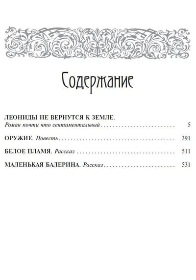 Vladimir Karatkevich's prose works of medium genre form touch upon complex socio-political collisions of Belarusian history of the 16th-19th centuries. Complex intricacies of plots, talentedly depicted characters, real and fantastic events, an open author's voice make the reader think about the continuity of human existence on earth and their place on it, about understanding good and evil, mercy and deceit, love and hate. This volume includes the novel "The Leonids Will Not Return to Earth", the story "Weapon" and two short stories.