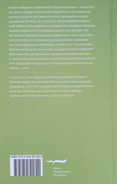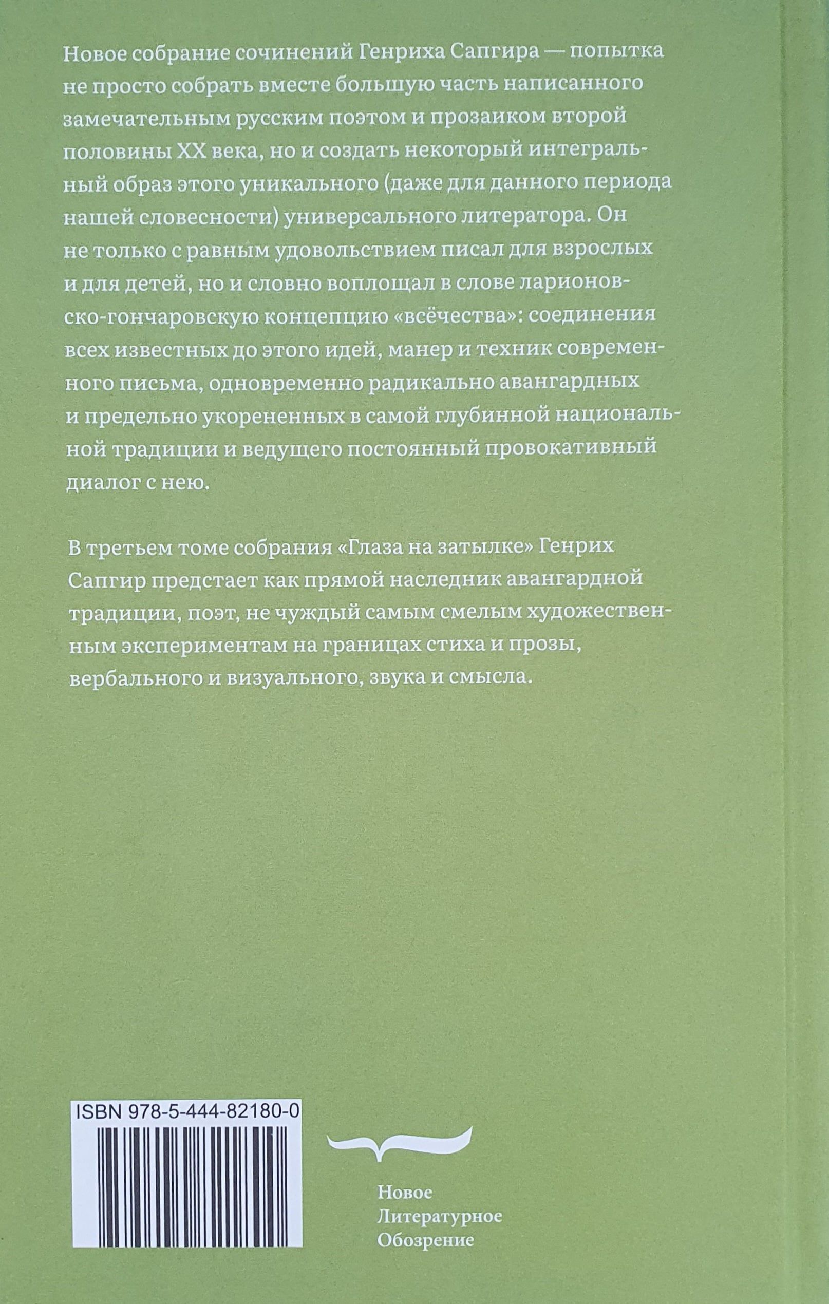 The new collection of Genrikh Sapgir's works is an attempt not only to bring together most of what was written by the remarkable Russian poet and prose writer of the second half of the twentieth century, but also to create an integral image of this unique (even for this period of our literature) universal writer. He not only wrote with equal pleasure for adults and children, but also seemed to embody in the word the Larionov-Goncharov concept of "allness": a combination of all previously known ideas, manners, and techniques of modern writing, which is both radically avant-garde and extremely rooted in the deepest national tradition, and which is in constant provocative dialog with it. In the third volume of the collection, Eyes on the Back of the Head, Genrikh Sapgir appears as a direct heir to the avant-garde tradition, a poet who is no stranger to the most daring artistic experiments on the borders of verse and prose, verbal and visual, sound and meaning.