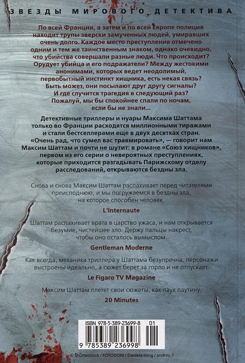 All over France, and then all over Europe, the police find the corpses of brutally tortured people who have been dying for a very long time. Each crime scene is marked with the same mysterious sign, but it is obvious that different people committed the murders. What's going on? Are the killer and his imitators at work? Is there some kind of connection between the violent anonymous men, driven by an irresistible, primal predatory instinct? Could it be that they are sending signals to each other? And where will tragedy strike next time? Perhaps we would sleep more peacefully at night if we didn't know ... Detective thrillers and noirs Maxime Shattam only in France are sold in millions of copies and have become bestsellers in two dozen countries. Fans of Jean-Christophe Grange and Frank Tillier can not help but appreciate these tightly twisted novels, in which events rush at full speed from the first lines to absolutely stunning finale and none of the characters are not treated with light bruises. "I am very glad that I managed to traumatize you," Maxim Shattam tells us and almost not joking: in the novel "Union of Predators", the first of his series of incredible crimes that have to solve the Paris investigation department, opens the abysses of evil.