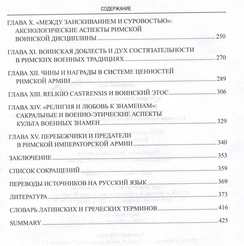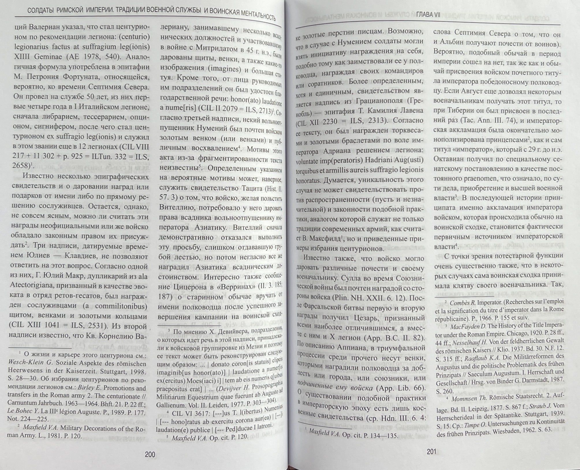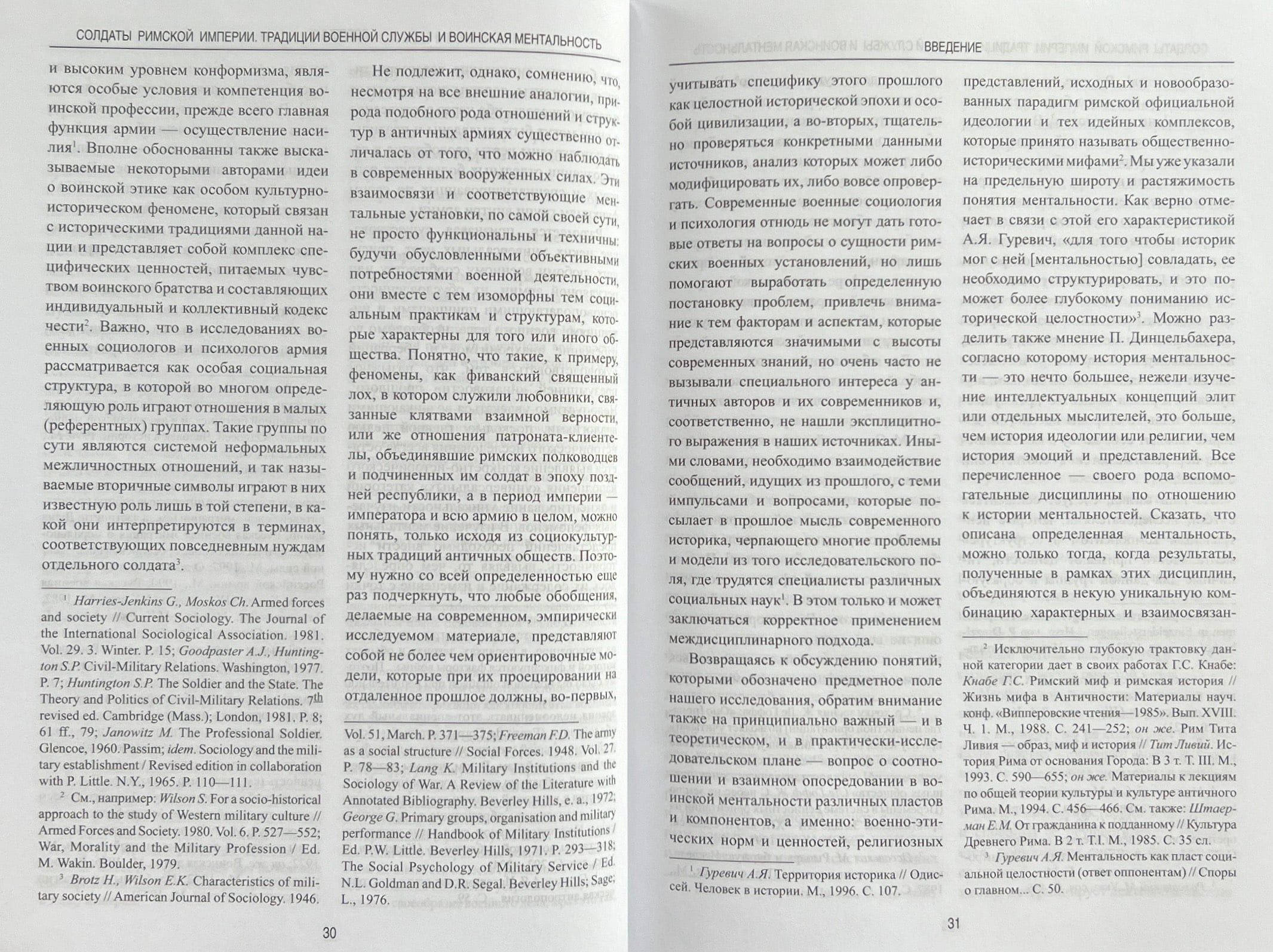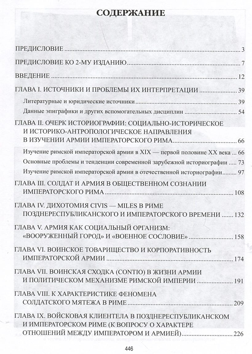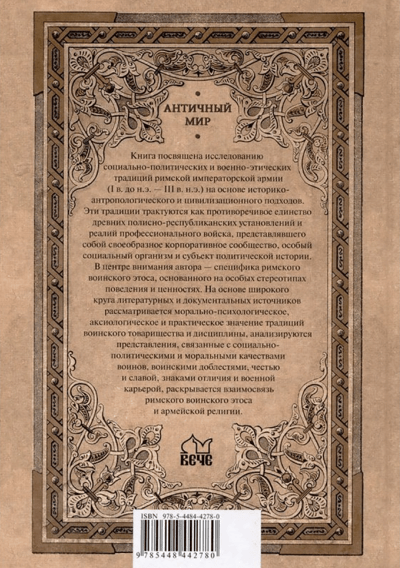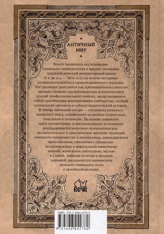The book is devoted to the study of socio-political and military-ethical traditions of the Roman Imperial Army (1st century BC - 3rd century AD) on the basis of historical-anthropological and civilizational approaches. These traditions are interpreted as a contradictory unity of ancient political-republican institutions and the realities of the professional army, which was a kind of corporate community, a special social organism and a subject of political history. The author focuses on the specificity of the Roman military ethos based on special stereotypes of behavior and values. On the basis of a wide range of literary and documentary sources the moral and psychological, axiological and practical significance of the traditions of military comradeship and discipline is considered, the perceptions related to socio-political and moral qualities of soldiers, military valor, honor and glory, insignia and military career are analyzed, the interrelation of the Roman military ethos and army religion is revealed. The mechanisms and forms of the army's participation in political processes and the relationship between the emperor and the army are also studied.