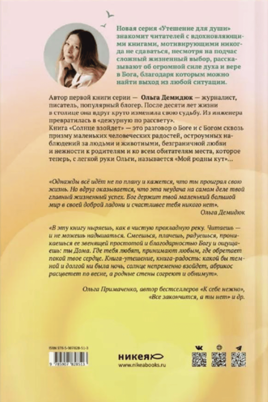 "The Sun Will Rise" is a collection of simple stories by journalist and writer Olga Demidyuk. A leisurely story about the everyday life of a village in the house of her ancestors, into which the author suddenly found herself after ten years of the whirlwind of a huge city. And literally in one moment she risked drastically changing her fate. From an engineer she turned into a "dawn duty officer". A conversation about God and with God through the prism of small human joys, witty observations of people and animals, boundless love and tenderness for parents and for all the inhabitants of the place that is now, with Olga's light hand, called "My Rodny Kut".