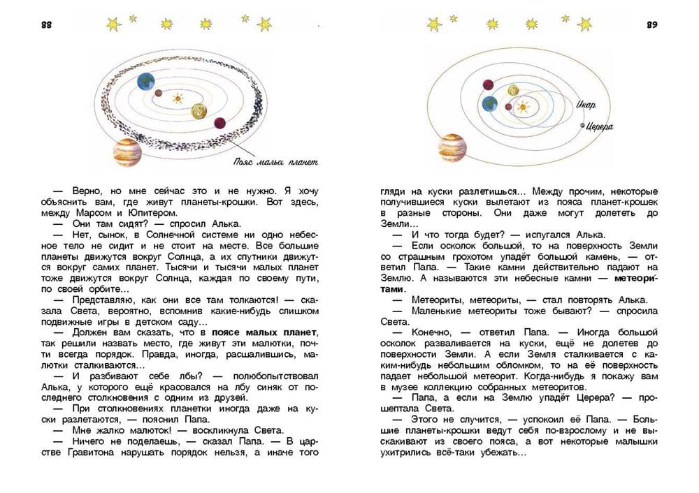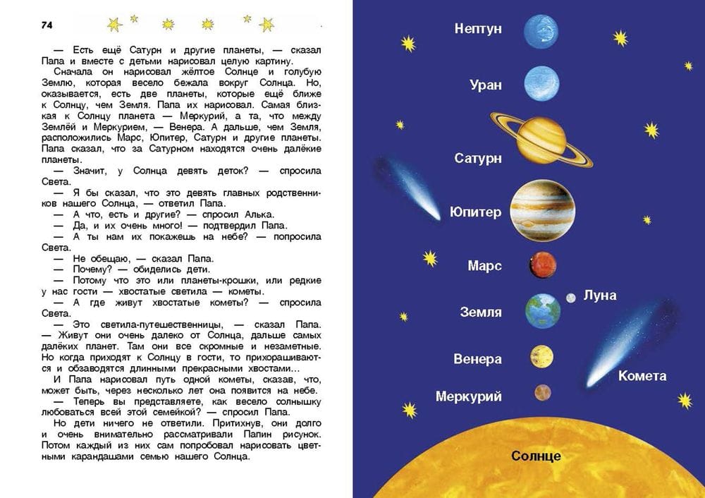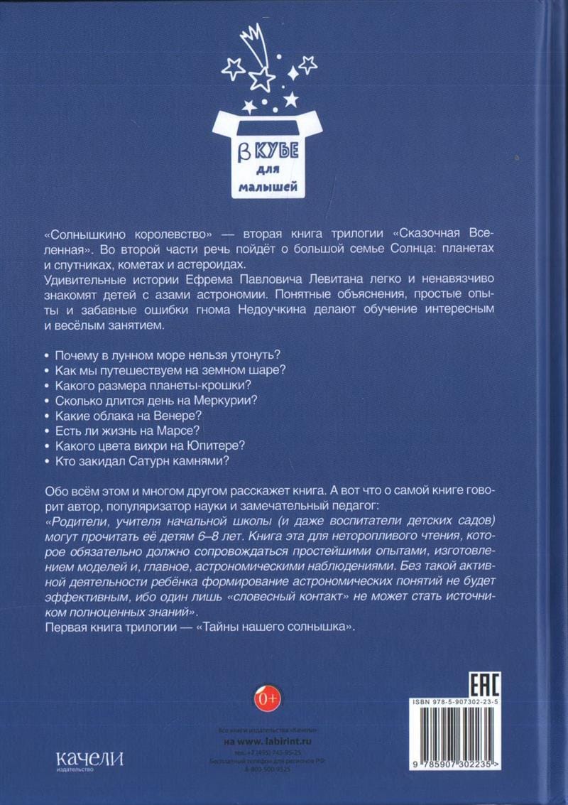 Sunny's Kingdom is the second book of the Fairy Tale Universe trilogy. In the second part we will talk about the big family of the Sun: planets and satellites, comets and asteroids. Amazing stories by Efrem Pavlovich Levitan easily and unobtrusively familiarize children with the basics of astronomy. Clear explanations, simple experiments and funny mistakes of the gnome Nedouchkin make learning an interesting and fun activity. And here is what the author, popularizer of science and a wonderful teacher says about the book: "Parents, elementary school teachers (and even kindergarten teachers) can read it to children 6-8 years old. This book is for leisurely reading, which must be accompanied by simple experiments, making models and, most importantly, astronomical observations. Without such active activity of a child, the formation of astronomical concepts will not be effective, because verbal contact alone cannot become a source of full-fledged knowledge".