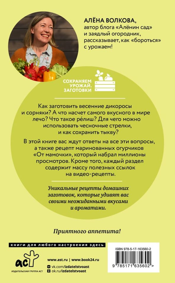 This book will give you answers to all these questions, as well as a recipe for pickled cucumbers "From Mommy", which has gained millions of views. In addition, each new section contains a lot of useful links to video recipes. And that's not all! In the book you will find a set of stickers for convenient labeling of blanks.