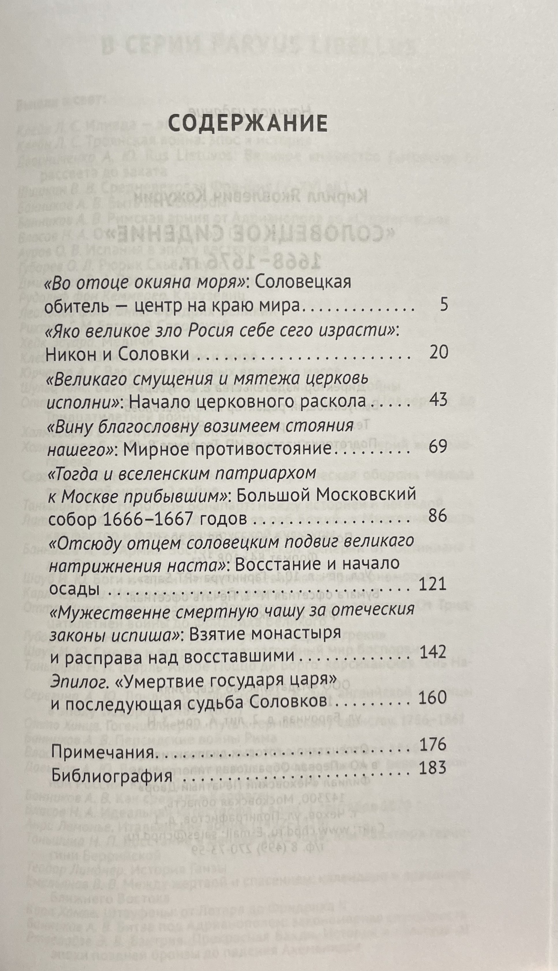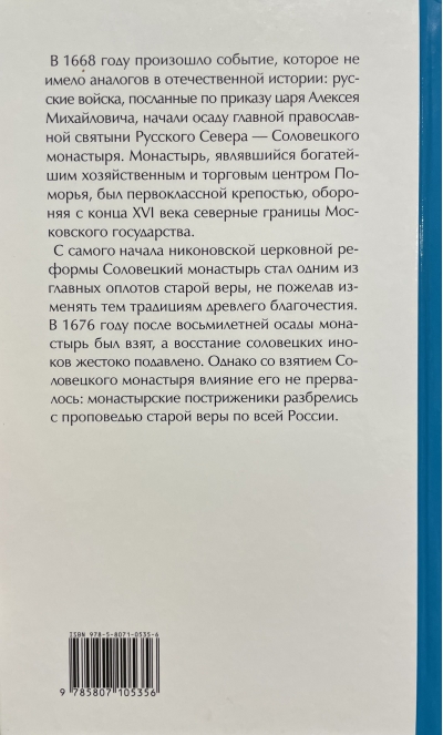 This book by St. Petersburg writer, philosopher, and historian Kirill Kozhurin is dedicated to one of the central moments in Russian political and ecclesiastical history: the revolt of the monks of the Solovetsky Monastery, who refused to accept the church reforms instituted by Patriarch Nikon and Tsar Alexei Mikhailovich in the mid-17th century and endured an eight-year siege by the tsar's troops. Based on authentic historical documents and the works of his predecessors, the book recounts the course of the revolt itself, its prehistory, and its manifold consequences.
