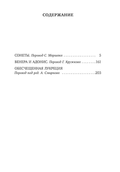 "The truest poetry is fiction," asserted the English poet and playwright William Shakespeare (1564-1616). "Fictional truth" of his creations turned out to be the nucleus, the center around which the vast Shakespearean universe was formed. In the sonnets William Shakespeare speaks mainly about love, which "knows no waning or decay" and has many guises. The erotic poem "Venus and Adonis" (1593; Shakespeare called it "the first-born of my imagination") shows the obsession with passion in the most earthly sense of the word: the goddess of love unsuccessfully seeks reciprocity from a mortal young man of dazzling beauty. The basis of the poem "Impoverished Lucretia" (1594) was the tragic story of a beautiful and virtuous Roman matron. Poetic experiments of the young Shakespeare and sonnets, with their wise brevity, will allow the modern reader to get a fuller picture of the work of the great English master.
