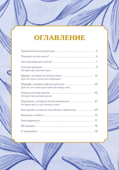 A collection of soothing stories and effective relaxation techniques from world sleep expert Alice Gregory and children's author Christy Kirkpatrick. Warm, lulling tales of Sleepy Pebble, Grandpa Oak, cute snail Ole, cheerful giraffe Gabrielle, and funny piglet Paul will soothe baby to sleep. The stories are based on scientific research, recommendations of sleep experts and psychologists. Each of them combines three elements useful for relaxation: Imagination: the child will be able to visualize in the smallest detail the event described in the story. The imaginary picture will captivate him, and disturbing thoughts have no place. Muscle relaxation exercises - an effective non-medication method of fighting insomnia. Mindfulness practices - slowing down, being in the moment. Being in the moment means noticing, first, your own physical sensations, second, the thoughts that come into your head, and third, your surroundings (such as air temperature or sounds). Non-judgmental attention will reduce anxiety and relax your baby. At the end of the book are tips for parents. You'll learn what a "snooze" diet is, what role coolness and dimmed lights play in successful tuck-in, and when to go to bed. While working on the book, the authors conducted a study involving 100 families with children from 3 to 11 years old. Parents were asked to read the first version of the story "Sleepy Pebble" to their children on three consecutive evenings. The participants were then asked to answer questions, the main one being "What was the overall effect of reading the story on your child's sleep?". Based on the responses, 80 out of 104 children (77%) showed a positive effect. Get under the covers soon - Sleepy Tales is waiting for you! Good night and sweet dreams. From the authors: We suggest choosing one story each night and reading it just before bedtime. When it's time to read, invite your child to lie down, close his eyes and be quiet for a while. Try to read in a steady, soothing voice, slowly and softly. Explain that this is a special, "sleepy" book, that it is different from the ones you usually read, and that you should listen to it lying in bed. The stories and practices will help your child relax before bedtime. After finishing the story, you should turn out the light and try to keep the bedroom quiet. Now it is time to wish the children sweet dreams.