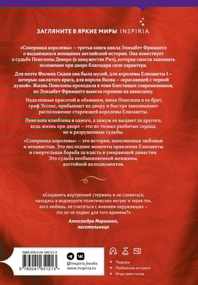 For the poet Philip Sidney she was a muse, for Queen Elizabeth I - the daughter of her sworn enemy, for King James - "a beauty with a black soul". Penelope's life passed in the shadow of brilliant contemporaries, but Elizabeth Freemantle brought the heroine to the forefront. Endowed with beauty and charm, young Penelope and her brother, the Earl of Essex, arrive at court and quickly win the favor of the aging Queen Elizabeth. Penelope is in love with one, but is married off to another, for life at court is not only about broken hearts, but also shattered destinies.