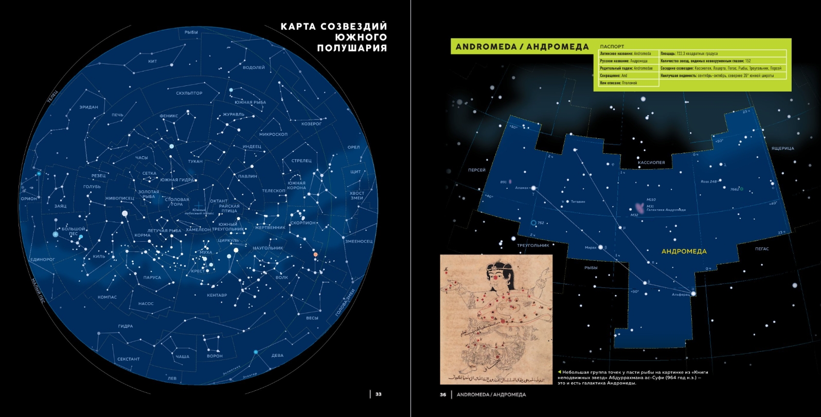 For the convenience of readers, to facilitate finding constellations in the sky, each constellation has a "Passport"—a description with its characteristics. The "Passports" are colored in three colors: green—constellations of the Northern Hemisphere, yellow—equatorial constellations, and blue—constellations of the Southern Hemisphere.