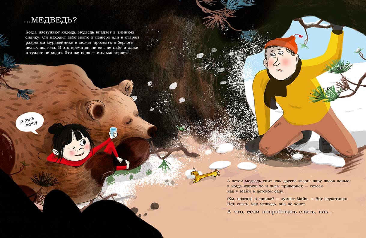 Daddy calls Maya to bed, but she has so much to do! And why does she have to go to bed every night? It's so boring! It's much more fun to sleep upside down on a tree branch like a bat. Or in the shell, like a snail: you can at any second climb into the house, which is on your back, and sleep for a day or two. How comfortable! Or sleep in the ocean with your eyes open, like a shark. You swim and you sleep. Or lying on your back like an otter, surrounded by all your family and holding each other with your paws. It's beautiful! Or like a walrus, who falls asleep anywhere and in any position. Or like a bear who sleeps all winter and does not know what cold, snow and wind are. But in the summer he sleeps very little. Isn't that great? So Maya decides to give it a try! But in the end she realizes that she doesn't want to sleep in frozen mud like a frog. And she can't sleep standing up like a zebra. She needs more sleep than a giraffe, but less than a bear. After trying everything, she remembers her warm crib and decides she'd rather sleep like a baby! There are not many books in children's literature about animals that tell how different members of the animal world sleep. Following Maya, the child learns about the "sleeping habits" of a bat, a snail, a shark, an otter, a bear, a giraffe, a zebra, a walrus, a duck, a ferret, a frog... and a human!