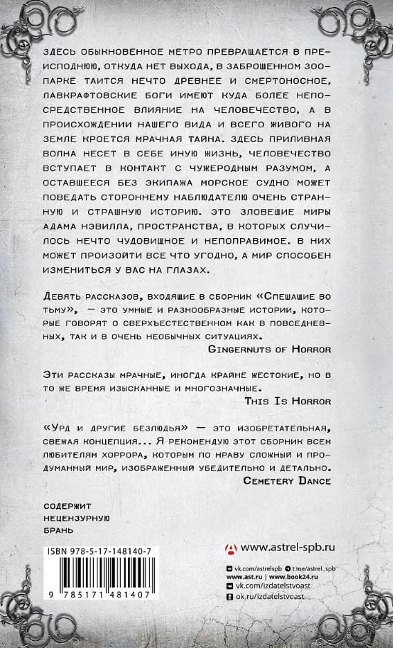 Here, an ordinary subway turns into an underworld from which there is no exit, something ancient and deadly lurks in an abandoned zoo, Lovecraftian gods have a much more direct influence on humanity, and a dark secret lies in the origin of our species and all life on Earth.