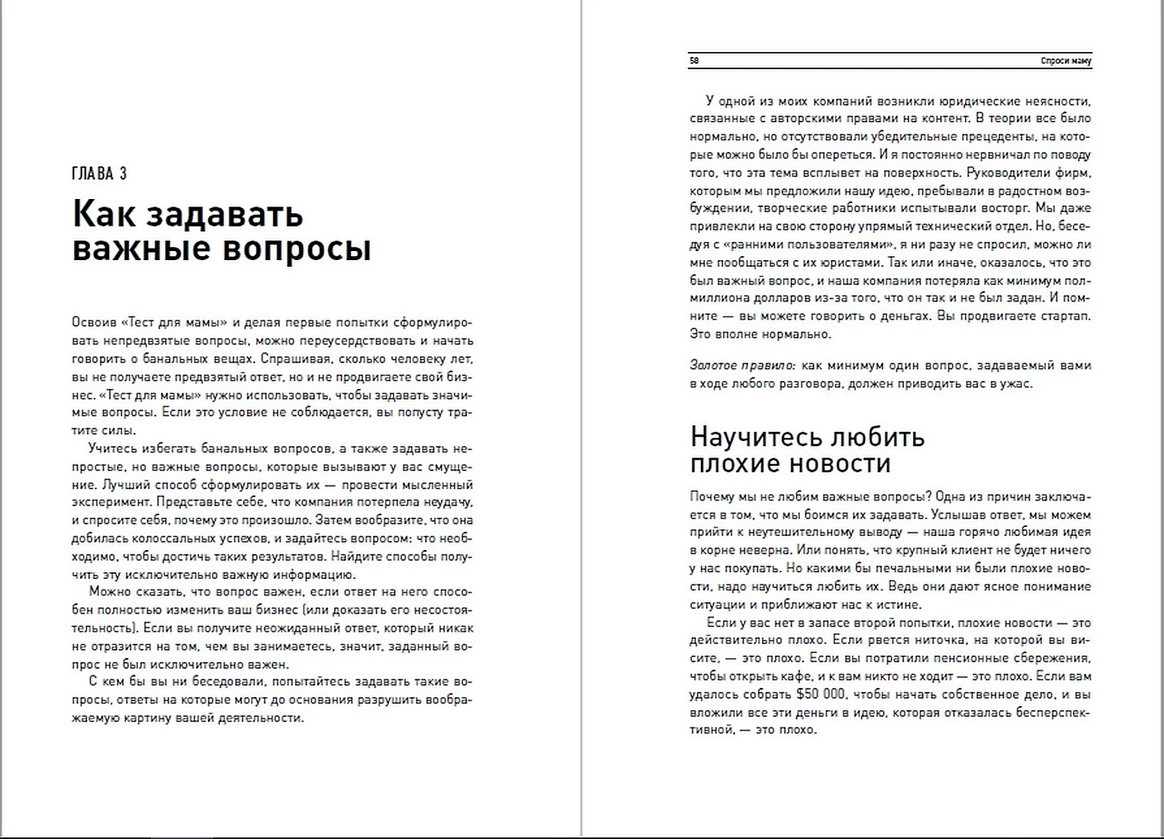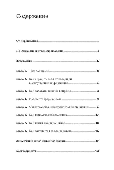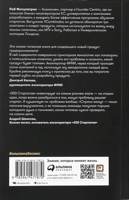 I still remember when we organized presentations of entrepreneurs for grandmothers at SKOLKOVO with the company Baba-Deda. For real grandmothers. And how difficult it was for the speakers to find simple but very necessary words. To get away from all their acronyms and anglicisms. The event was a smashing success. That's why I recommend this book to everyone. Speaking the same language as the consumer, asking the right questions and being able to do it on time are key qualities of an entrepreneur. Mikhail Khomich Director of Development at the Moscow State University Business Incubator, Head of the SKOLKOVO Mentor Association This is the most useful book for an entrepreneur creating a new product! It contains absolutely applied technology: how to talk to a potential client, find out their problems and realize what kind of product will be useful. The FRII gas pedal, through which hundreds of companies a year pass, uses this methodology every day. I highly recommend reading this book before you spend your first ruble on product development. .Dmitry Kalaev Head of the FRII gas pedal. About: Steve Blank, the guru of the startup movement, says that the most important thing for a budding entrepreneur is to "get out of the office", that is, to start directly finding out from customers what they need. Whether you get the really important information, however, depends on what questions you ask. By the way, the most popular question - "Do you like our idea or product"? - is wrong. It's like asking your mom if she likes your idea: she loves you and will praise you anyway, not wanting to upset you. That's what 99% of customers do, too. In general, to be a successful entrepreneur, you need to know how and what exactly to ask, and Rob Fitzpatrick's book will teach you how to do it! The author will help you understand when the answer is given out of politeness and has no value, will tell you in what direction to develop the conversation, what clarifying questions to ask, how to avoid socially desirable answers, how to understand what is good or bad in the product, whether the market needs it, how to position it correctly - and all this with many real examples. What you have in front of you is a concise, useful, and humorously written practical guide to effective communication between an entrepreneur and his customers. It will help you save time, money, and nerves. Quote I'm a techie, not a salesman. All the books on the art of selling that I have had the opportunity to read have been written by and for those who have already mastered working with people quite well. They are familiar with the unspoken rules of communication. I had to master them with great difficulty, literally from scratch. You've probably heard the phrase: "You don't call me, I'll call you"? I was told that phrase too (and I believed those words). Thanks to the invaluable help of my peers and mentors, I finally learned the ropes and was able to land deals with companies like Sony and MTV. But I also learned about the deep gulf that lies between the numbers in textbooks and bank statements. Rob Fitzpatrick Learn how to communicate with customers so that you get the most relevant information from them about your business idea or product.Learn many examples of the right and wrong questions you should or shouldn't go to customers with.Learn how to interpret customer responses and what counter-questions to ask to clarify their needs. For entrepreneurs, startups, mentors, salespeople, and economics students.