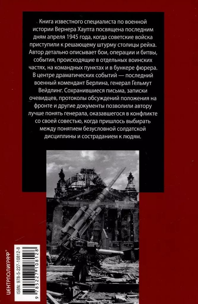 The book by the renowned military history specialist Werner Haupt is dedicated to the last days of April 1945, when Soviet troops began the decisive assault on the capital of the Reich. The author describes in detail the battles, operations and fights, the events taking place in individual military units, at command posts and in the Fuhrer's bunker. At the center of the dramatic events is the last military commandant of Berlin, General Helmut Weidling. Surviving letters, eyewitness accounts, minutes of discussions of the situation at the front and other documents allowed the author to better understand the general, who found himself in conflict with his conscience when he had to choose between the concept of unconditional soldier discipline and compassion for people.