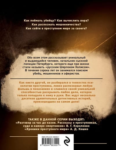 In forty years of work, he solved hundreds of crimes, many of which became resonant. He tells about the most interesting, clever and witty crimes on the pages of his memoirs. In the light and fascinating manner of a classic detective novel of the early 20th century, he tells about the structure of the criminal world, with bitter sadness tells about the difficult fates of robbers and murderers and sympathetically talks about the victims of crime. You will have a unique journey into the criminal world of St. Petersburg in the late 19th and early 20th centuries.