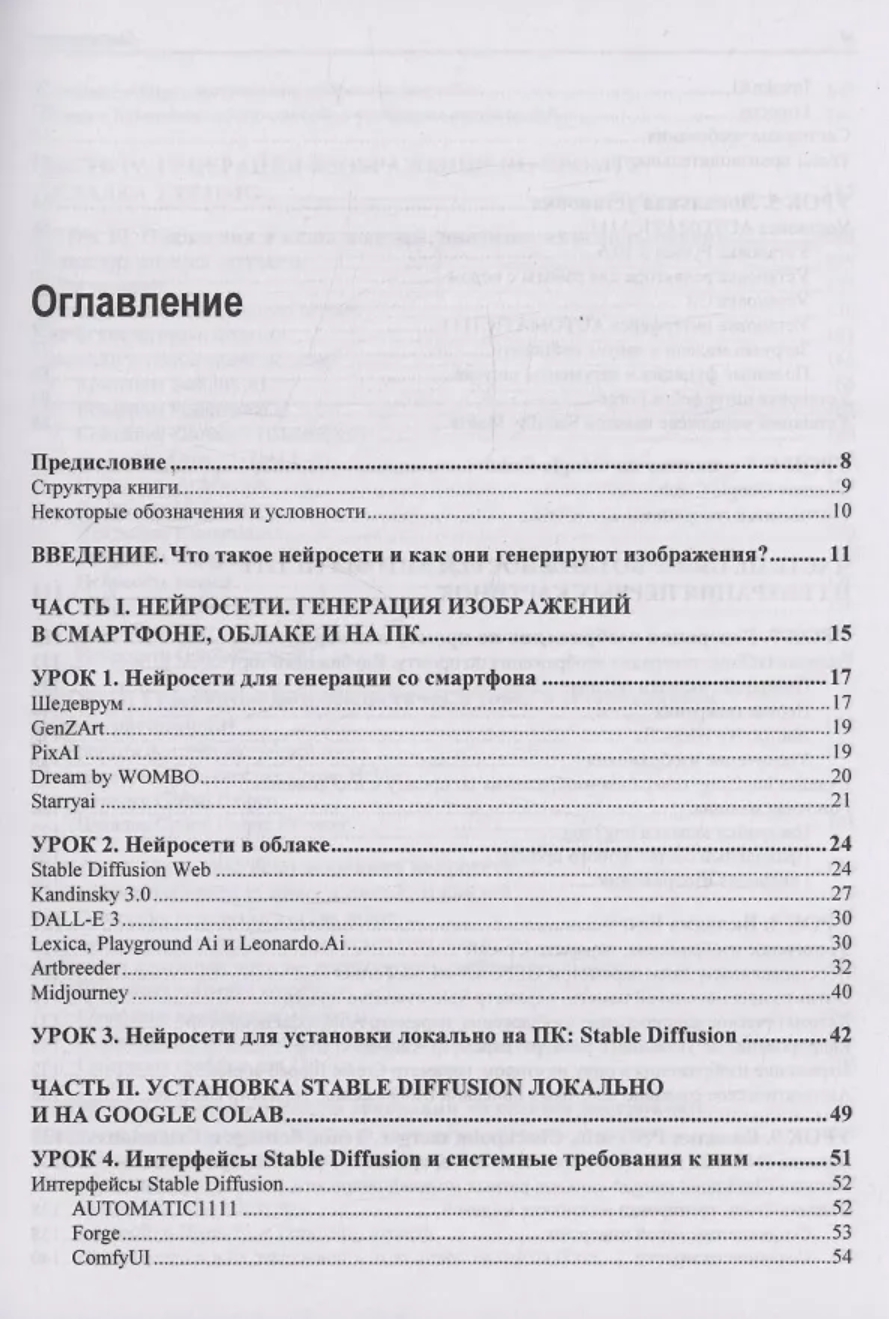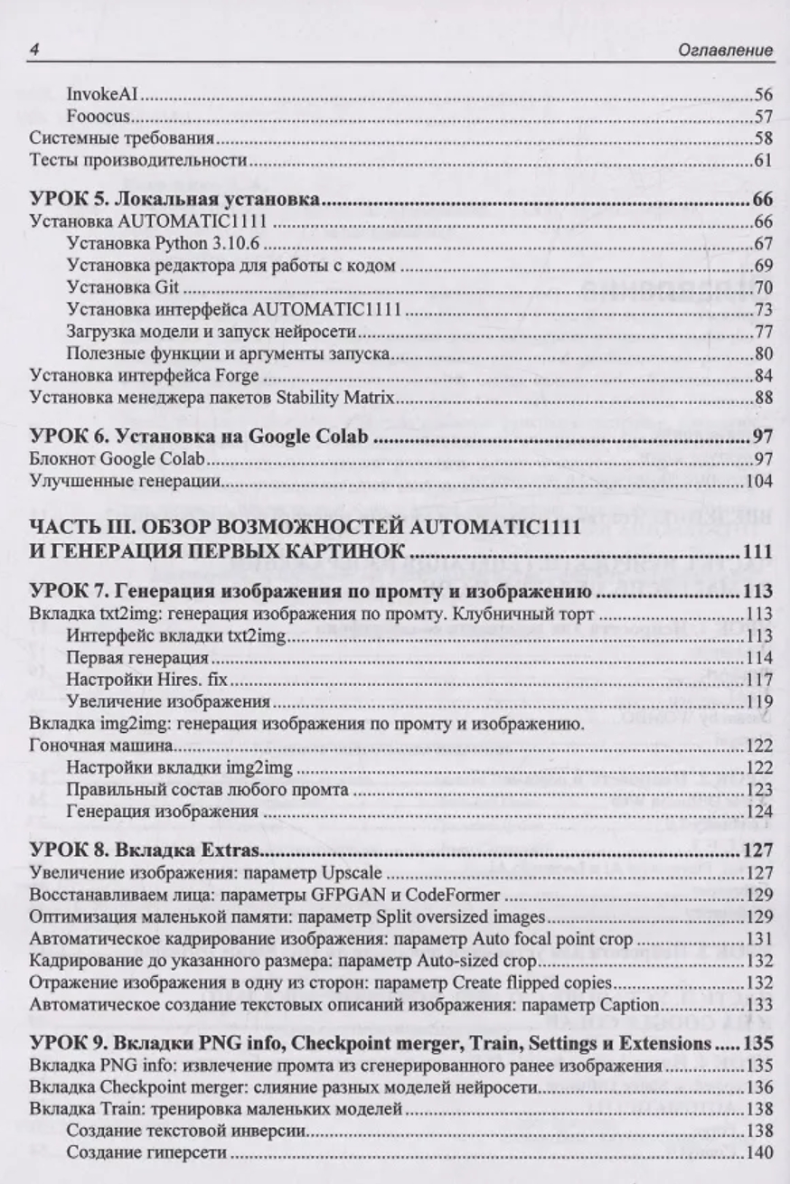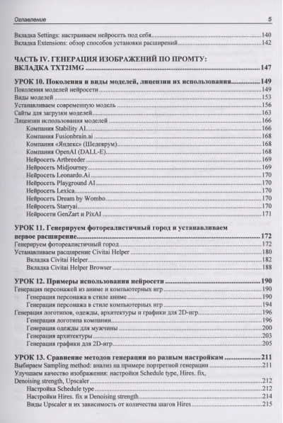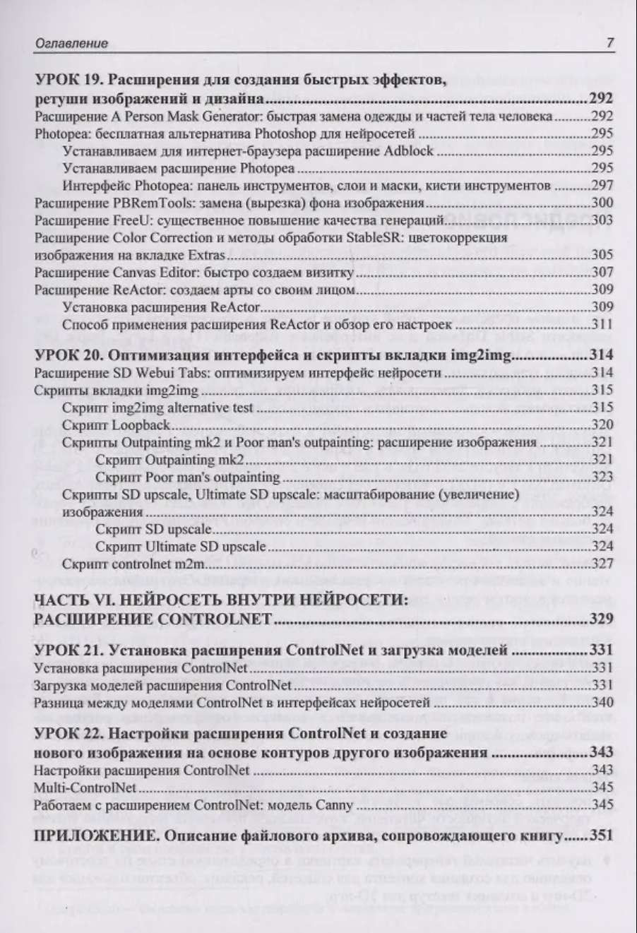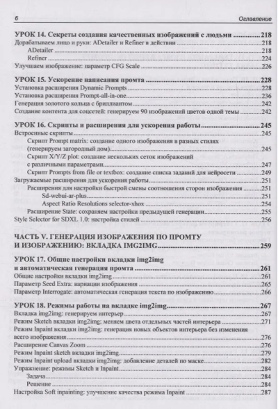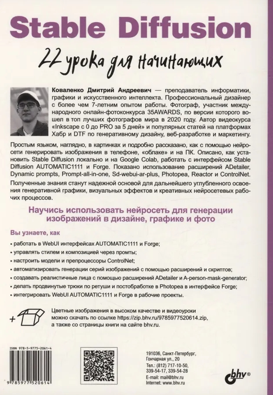 This book presents 22 illustrated lessons on working with the Stable Diffusion neural network in the AUTOMATIC1111 and Forge interfaces. For enhanced learning, accompanying video lessons have been developed, and a full breakdown of all ControlNet models and preprocessors is available on the Figma website. The book covers the following extensions: ADetailer, Civitai Helper, State, A-person-mask-generator, Dynamic Prompts, Prompt All-in-One, SD-WebUI-AR-Plus, Photopea, FreeU, Reactor, and ControlNet. Key features and settings are described, and application examples for image generation are provided. It explains how to manage style and composition through prompts, configure ControlNet models and preprocessors, automate image series generation using extensions and scripts, create realistic faces and other images, use advanced retouching and post-processing tricks, and integrate WebUI AUTOMATIC1111 and Forge into work projects.
