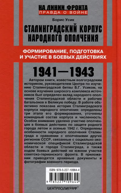 The author of this book, renowned Volgograd historian B.G. Usik, director of the Center for the Study of the Battle of Stalingrad, examined a wide range of sources to determine the contribution of the Stalingrad Region People's Militia and workers' battalions to the Great Victory. The work objectively presents the history of the Stalingrad People's Militia Corps, identifying the three stages of its formation and clarifying its command structure and strength. Particular attention is paid to the militia's participation in the military operations to defend their hometown in the summer and fall of 1942. The book identifies the characteristics of the Stalingrad People's Militia in comparison with militias in other regions of the USSR, owing to the socio-economic characteristics of the Stalingrad Region and the city of Stalingrad, as well as the course of military operations on the southern sector of the Soviet-German front. The appendix includes archival documents and photographs from the war period.