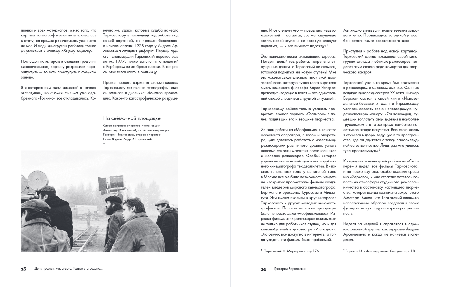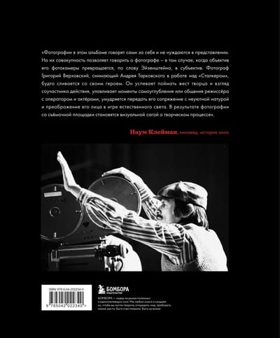 The film was remade three times (!!!). Each time "Stalker" was waiting for another fatal accident: the production defect, the spoiled film, the conflict between the director and the operator. In 1978, Andrei Tarkovsky suffered a heart attack, but this did not prevent him from starting all over again with a new team. Only the third time Tarkovsky managed to finish his masterpiece. This book will take you there, on the set of the film “Stalker”, 1978, where the assistant operator worked Grigory Verkhovsky. He was not only lucky to see with his own eyes how the great master works, but also to capture it in the photo. And now, almost half a century later, he is ready to share his memories with the world!
