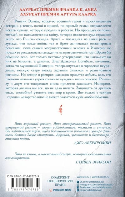 Ringil Esquiat, once a military hero and celebrated veteran, but now an outcast and a pauper, sets out at the request of his family to find his cousin, who has been sold into slavery. But in pursuit of her captors, he will stumble upon a secret that proves far more terrifying than anything Ringil expected. Archet - the last of her race - thought she'd pursue engineering after the war until the most powerful man in the Empire sent her to investigate an attack on a border port. Seems like a routine matter, except the locals claim it's not bandits attacking them, but demons. Egar Dragonslayer, a nomad who once served the Empire, is now embroiled in the town's turmoil, a petty squabble between common sense and religious zeal. But soon the quarrels of the shamans will have to be forgotten, for his tribe is beginning to be threatened by something alien and very dangerous. Ringil and his two comrades will once again have to defend the Empire, which owes them everything but has given them nothing. Protect from an ancient force that can drown the entire world in blood. Except that with such heroes, the cure may well be worse than any disease.