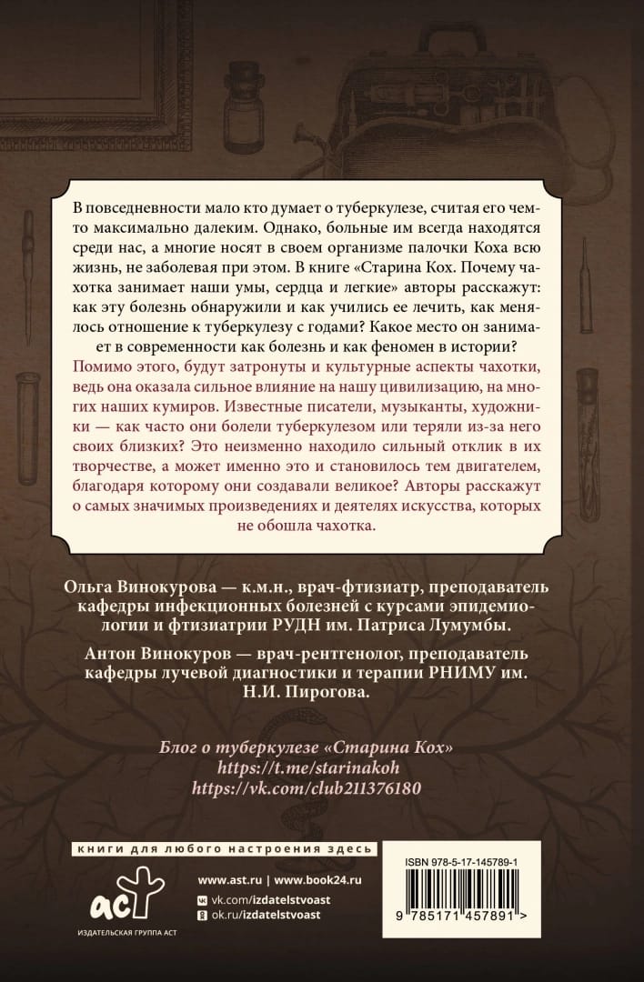 In everyday life, few people think about tuberculosis, considering it something extremely distant. However, those who are sick with it are always among us, and many carry Koch's bacilli in their bodies all their lives without getting sick. In the book "Old Koch. Why consumption occupies our minds, hearts and lungs" the authors will tell: how this disease was discovered and how they learned to treat it, how the attitude towards tuberculosis changed over the years? What place does it occupy in modern times as a disease and as a phenomenon in history? In addition, the cultural aspects of consumption will also be touched upon, because it has had a strong influence on our civilization, on many of our idols. Famous writers, musicians, artists - how often did they suffer from tuberculosis or lose their loved ones because of it? This invariably found a strong response in their work, or maybe this was the engine that drove them to create great things? The authors will tell about the most significant works and figures of art who were not spared by tuberculosis.