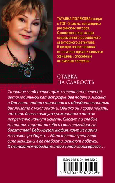 Tatyana Polyakova is one of the most popular Russian writers in the detective genre. During her writing career, she has written more than 85 books with a total circulation of over 36 million copies. According to readers, Tatyana Polyakova's novels are "a gripping plot and an unpredictable ending, charming characters and incredible adventures, an easy style and vivid dialogues."