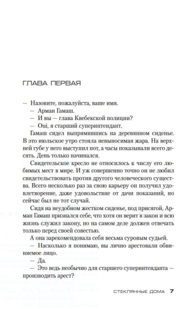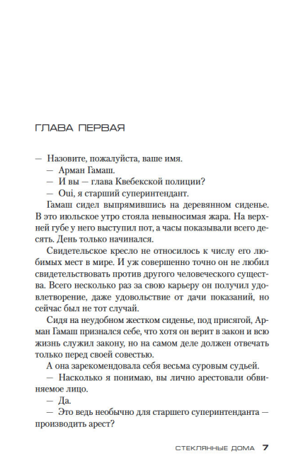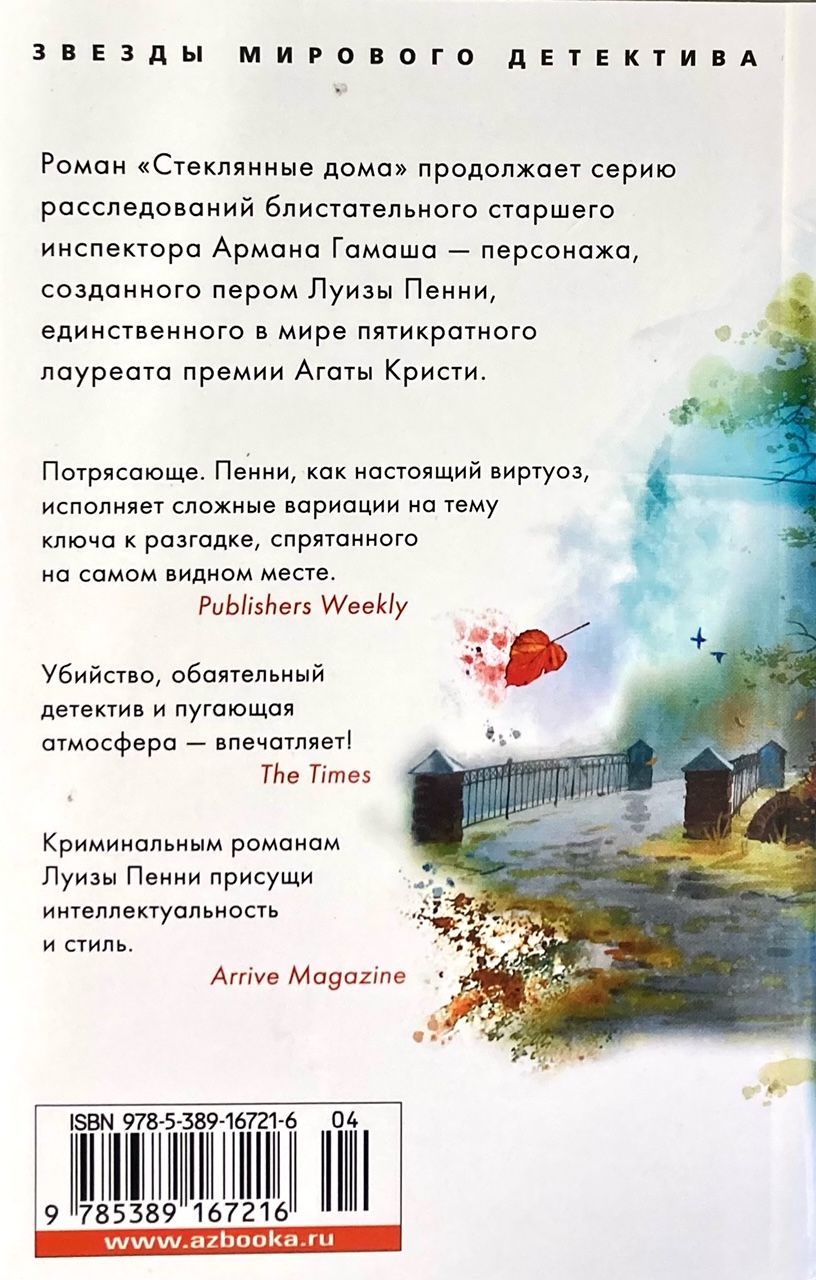 The novel "Glass Houses" continues the series of investigations of Chief Inspector Armand Gamache. This charming character is created by the pen of Louise Penny, the world's only five-time winner of the Agatha Christie Award. In the village of Three Pines, Halloween is being celebrated. However, the festive mood fades when a strange figure in a black robe and mask appears in the village meadow. Police Inspector Gamache, wanting to understand what kind of person this is, tries to talk to him, take him away. But the stranger stands firm, though he seems to have no intention of harming anyone. It turns out that he is a cobrador - a Spanish debt collector, who in the Middle Ages pursued debtors, silently appealing to their conscience. Who did the cobrador appear to in the village of Three Pines? While this question occupies the locals, the stranger disappears and a dead body in a debt collector's costume is found in the church basement. One of the guests who had come to the feast is murdered. The motive for the murder is unclear, but it seems that the victim saw something that was not meant for strangers' eyes...