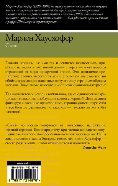The main character, whose name will remain unknown, arrives for a vacation at a hunting lodge in the mountains - and finds herself cut off from the world by a transparent wall. This invisible obstacle seems to have grown overnight: it can neither be broken nor bypassed, and all the people and animals on the other side are strangely frozen. Is it a trap or an escape from an unexpected disaster? So begins her story of survival, where loneliness is only brightened by a dog and a lost cat and cow. Day by day, recording in her diary what happens, the heroine recognizes a new self and reflects more and more on the main thing - is it possible to live without hope?