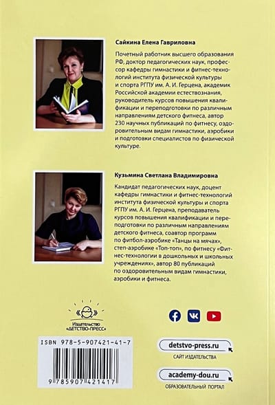 The publication is a generalization of the best practices accumulated in the theory and practice of health-improving physical culture and children's fitness. The book presents a detailed presentation of the author's concept of programs on step-aerobics "Top-top" for children aged 4-5 and 6-7 years, substantiates the role of fitness in the modernization of physical education of preschool children in order to improve health, increase the level of physical fitness and involvement in systematic physical education, involving the effective use of innovative health technologies, fitness technologies and musical accompaniment in the physical education of children. The publication presents figurative complexes of step-aerobics exercises that can be performed on gymnastic benches and massage mats, which makes it possible to solve various tasks. The manual is intended for specialists in physical culture of preschools, physical culture and sports organizations, fitness clubs, institutions of additional education, students of physical culture universities, as well as all those who are interested in the problems of physical culture of children.