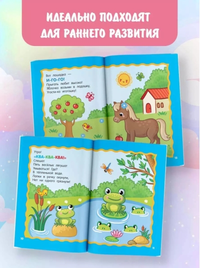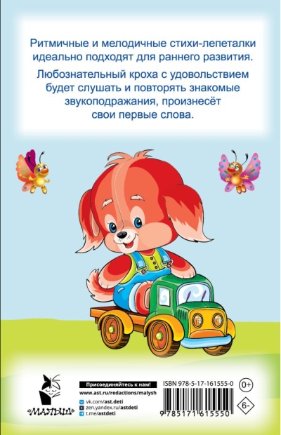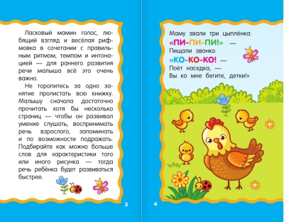 "‎Babbling poems to start speech. 100 poems"‎ - rhythmic and melodic poems, songs and nursery rhymes that are ideal for the development of speech, perception, attention, memory, imagination. A wonderful little book will help make the child's world fun and interesting - the baby will say his first words, become attentive and inquisitive, learn a lot of new things, master useful skills and learn to communicate.