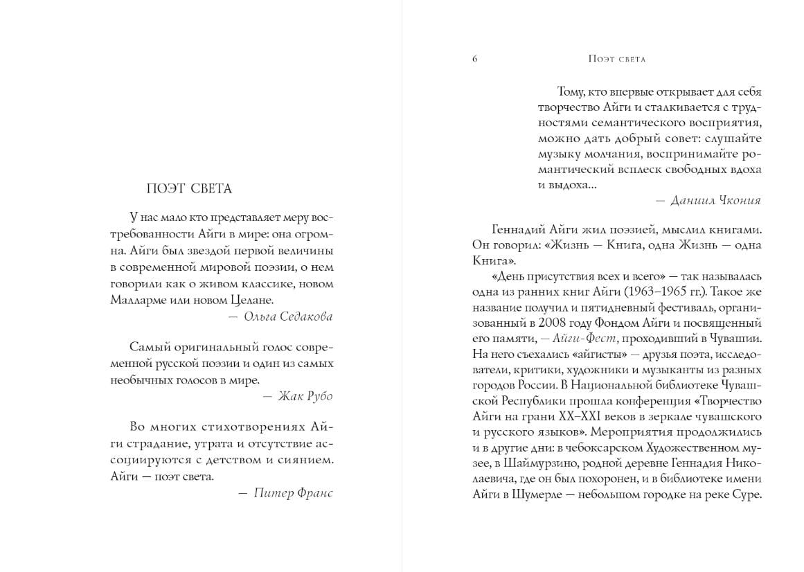 Gennady Aigi (1934–2006), a world-famous poet and translator who wrote in Chuvash and Russian; laureate of national and international awards: the French Academy (1972), A. Bely (1987), F. Petrarch (1993), the Golden Crown of the Struga Poetry Evenings (Macedonia, 1993), B. Pasternak (2000, first laureate), and others. Commander of the Order of Arts and Literature (1998). People's Poet of the Chuvash Republic (1994). He was repeatedly nominated for the Nobel Prize. This annotated edition of selected works includes poems from 1954–2003, the books “A Bow to Singing” (Variations on the Themes of Folk Songs of the Volga Region), “Sylvia’s World” and articles on cult figures of the Russian avant-garde: V. Mayakovsky, V. Khlebnikov, A. Kruchenykh, P. Filonov, E. Guro and others. The book is published to mark the 90th anniversary of G. N. Aigi’s birth.