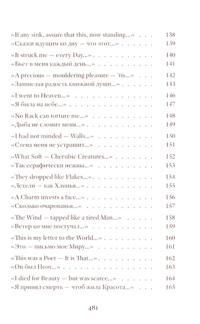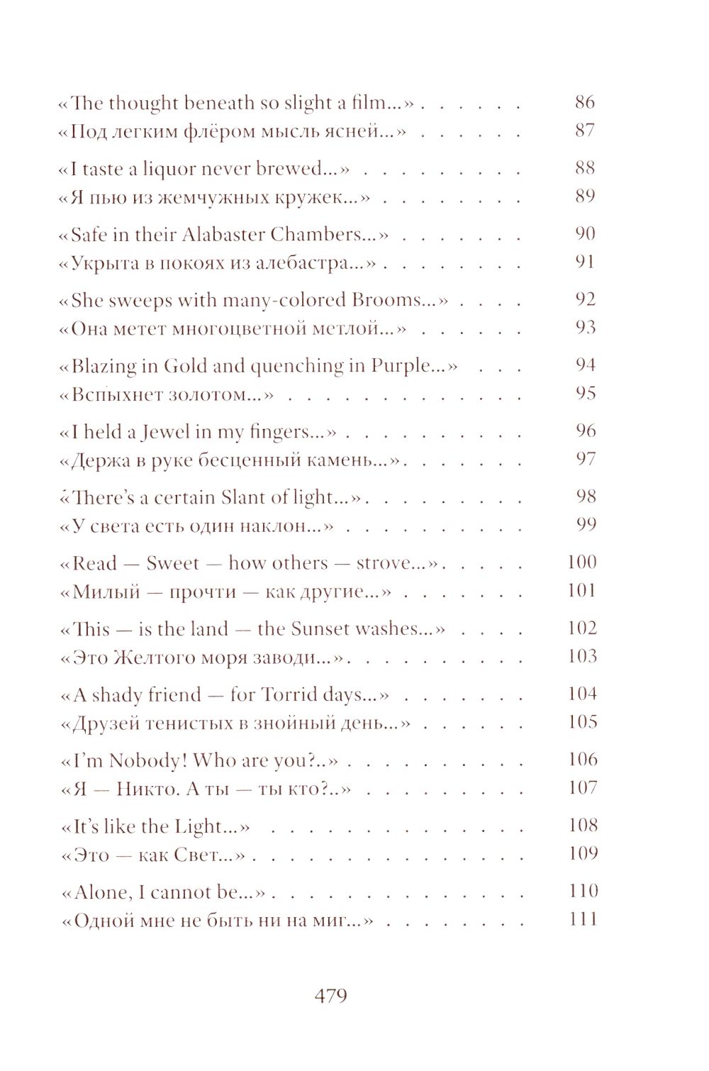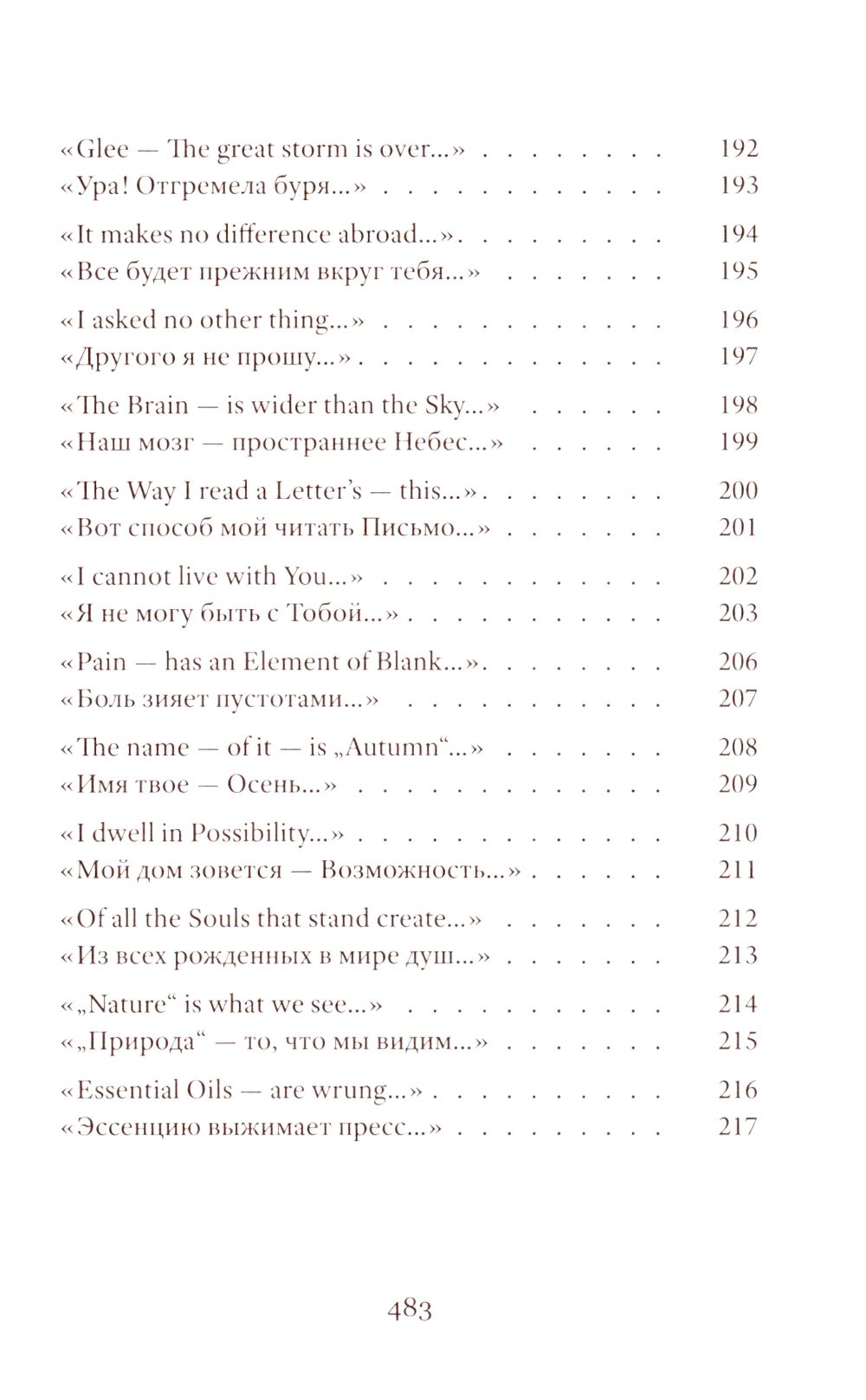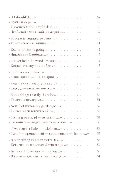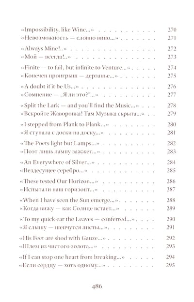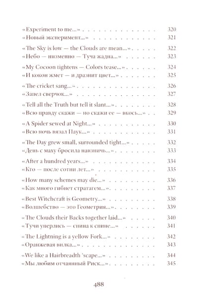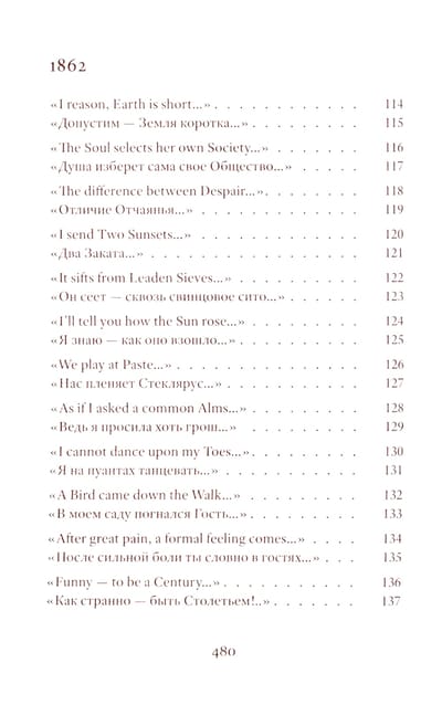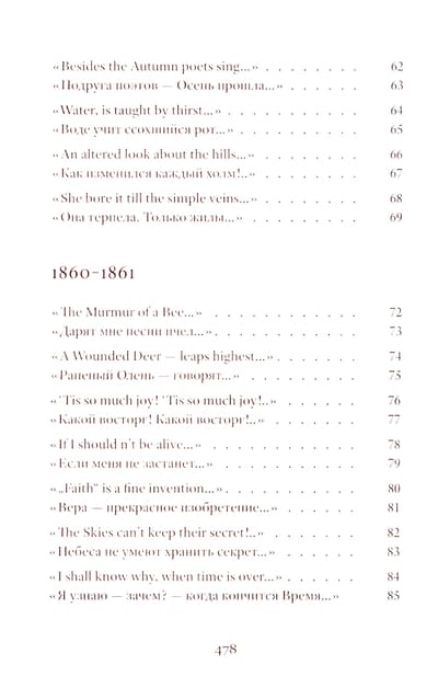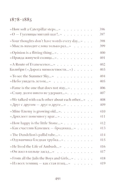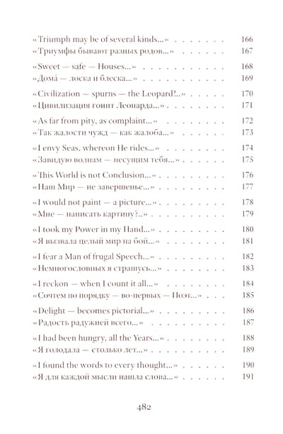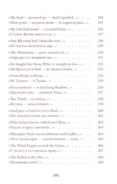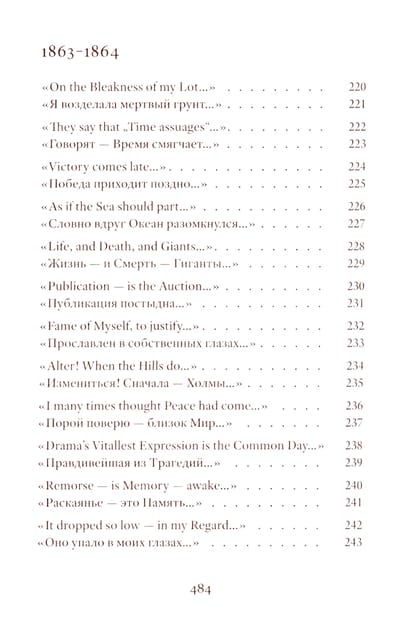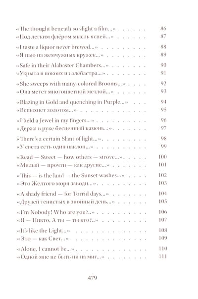 Emily Dickinson (1830–1886) was an American poet whose life remains shrouded in mystery. Her poetic vision is woven from subtle and deliberately opaque images. Her poetry contains a sharp intensity of feelings and stylistic restraint. The poems are presented in the original and in Vera Markova’s translation. Vera Markova (1907–1995) was a poet and translator, philologist, and researcher of classical Japanese literature. The similarity of their creative destinies creates a special connection between the original and the translation, allowing the latter to penetrate the depths of poetic thought with exceptional sensitivity.