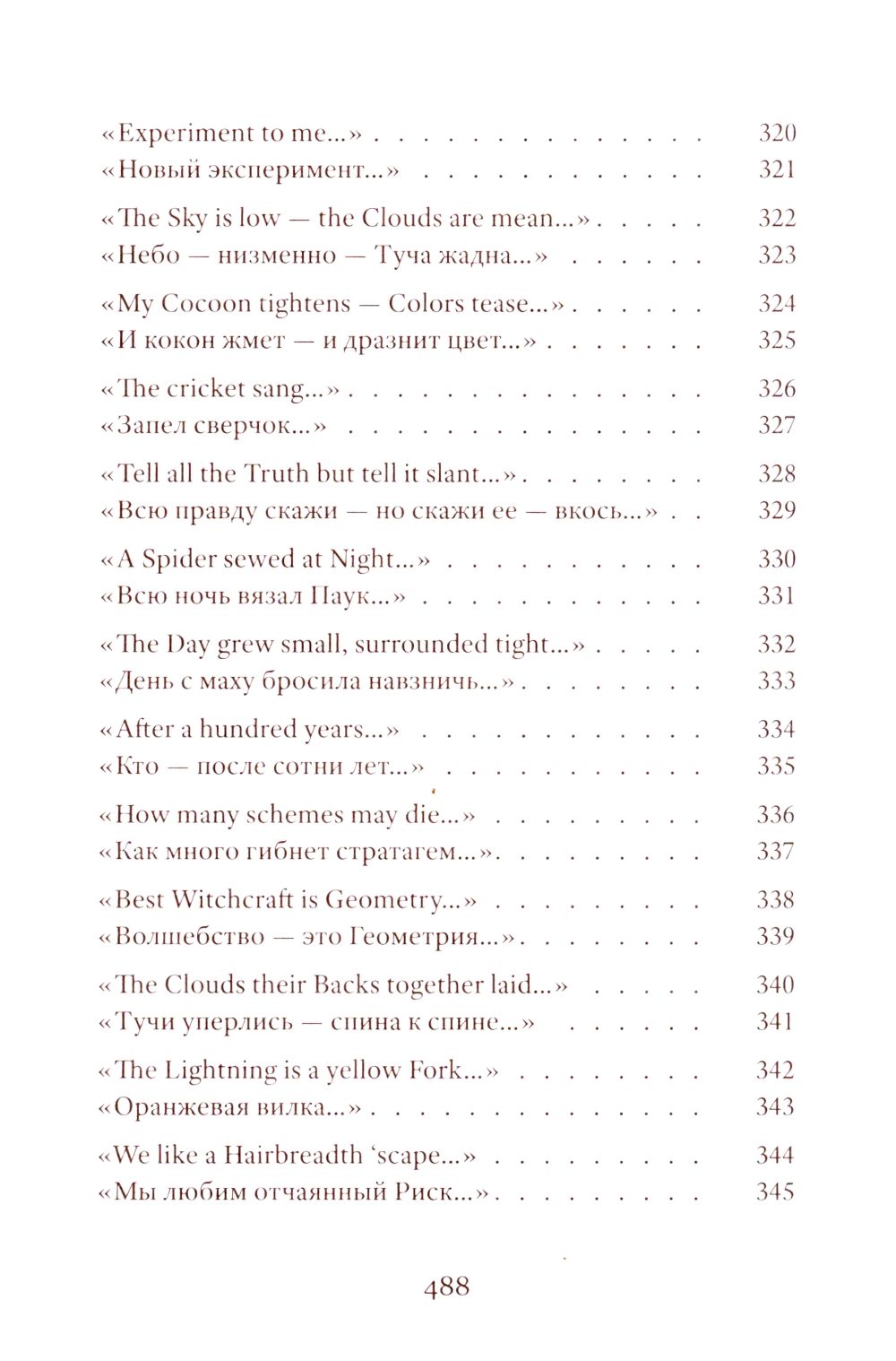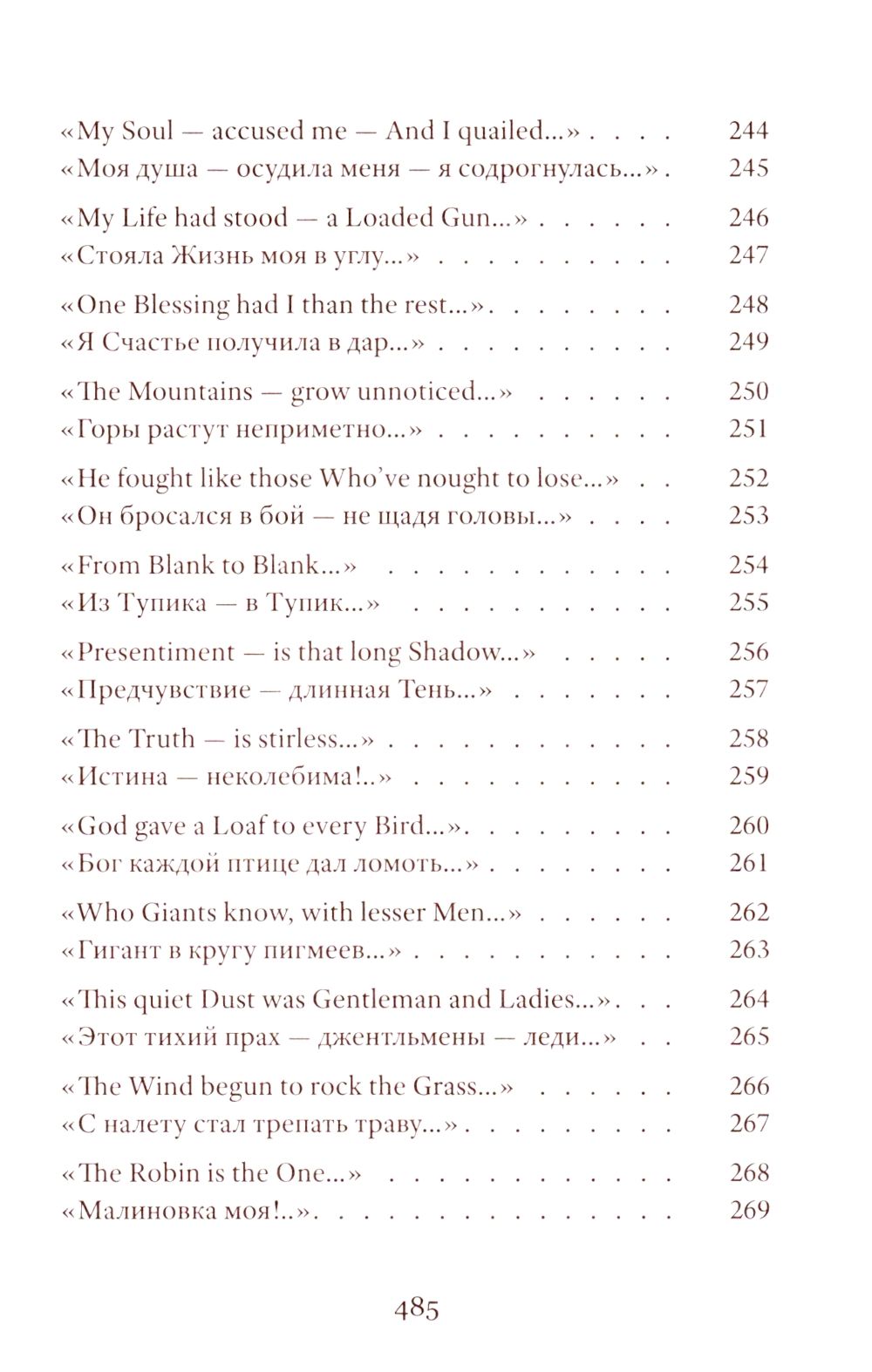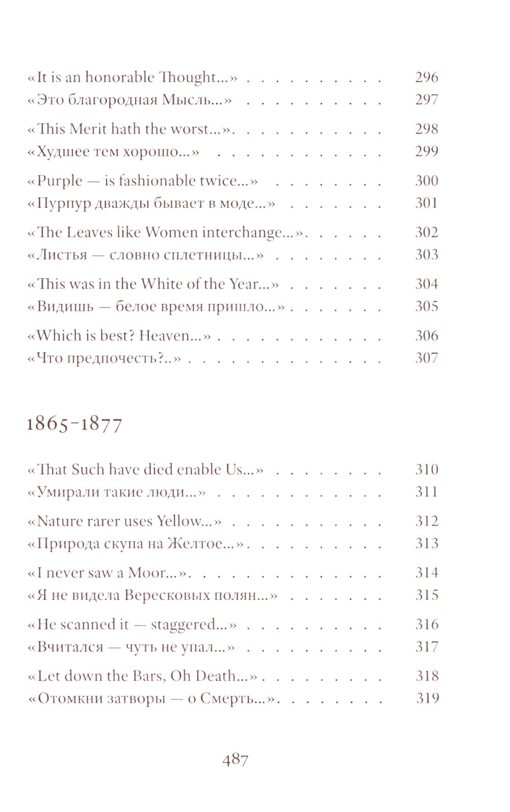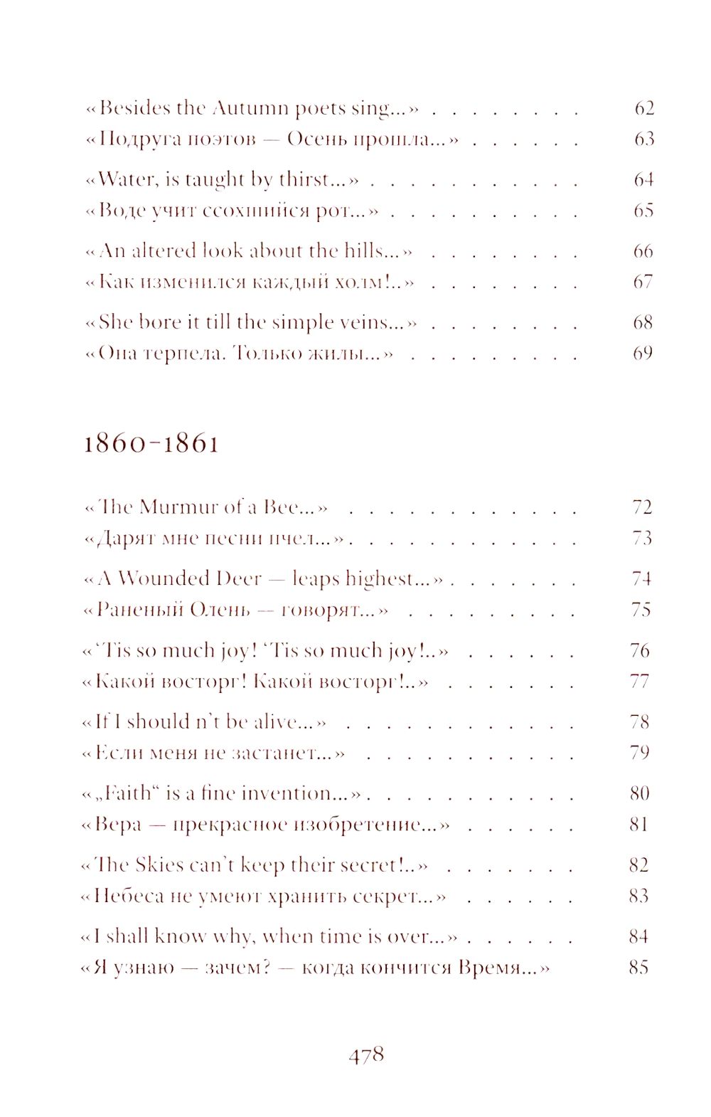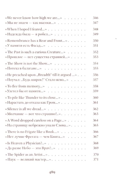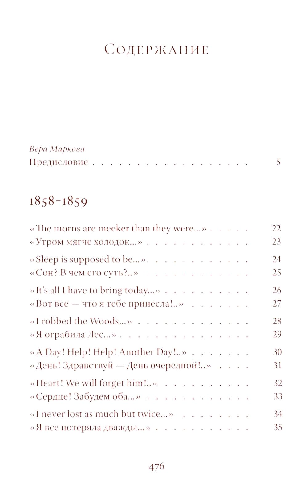 Emily Dickinson (1830–1886) was an American poet whose life remains shrouded in mystery. Her poetic vision is woven from subtle and deliberately opaque images. Her poetry contains a sharp intensity of feelings and stylistic restraint. The poems are presented in the original and in Vera Markova’s translation. Vera Markova (1907–1995) was a poet and translator, philologist, and researcher of classical Japanese literature. The similarity of their creative destinies creates a special connection between the original and the translation, allowing the latter to penetrate the depths of poetic thought with exceptional sensitivity.